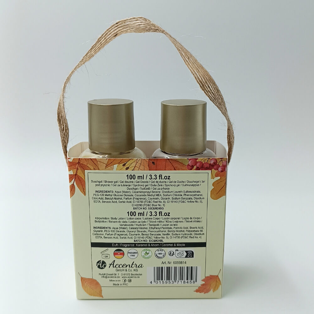 Ένα λαχταριστό, γιορτινό σετ σώματος που περιλαμβάνει 1 αφρόλουτρο 100 ml και 1 body lotion 100 ml, με γλυκό και ζεστό άρωμα Caramel & Maple.