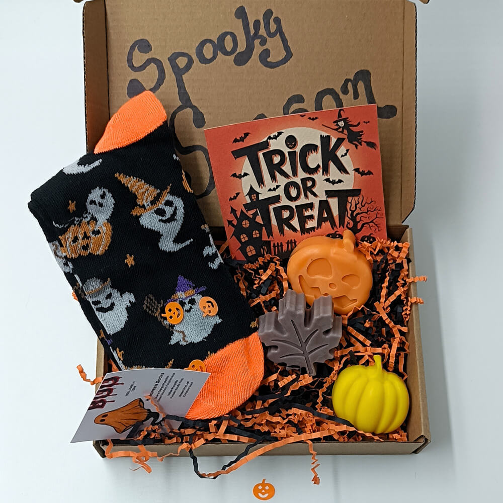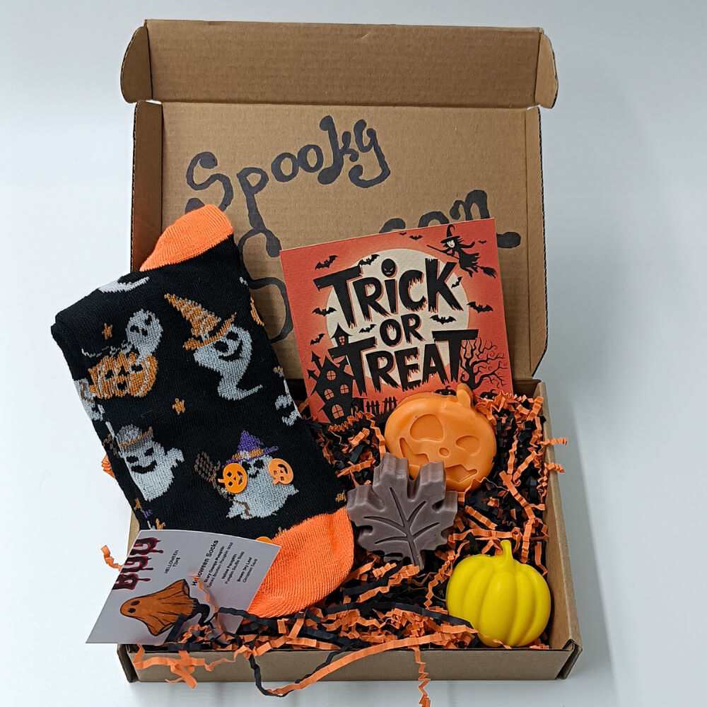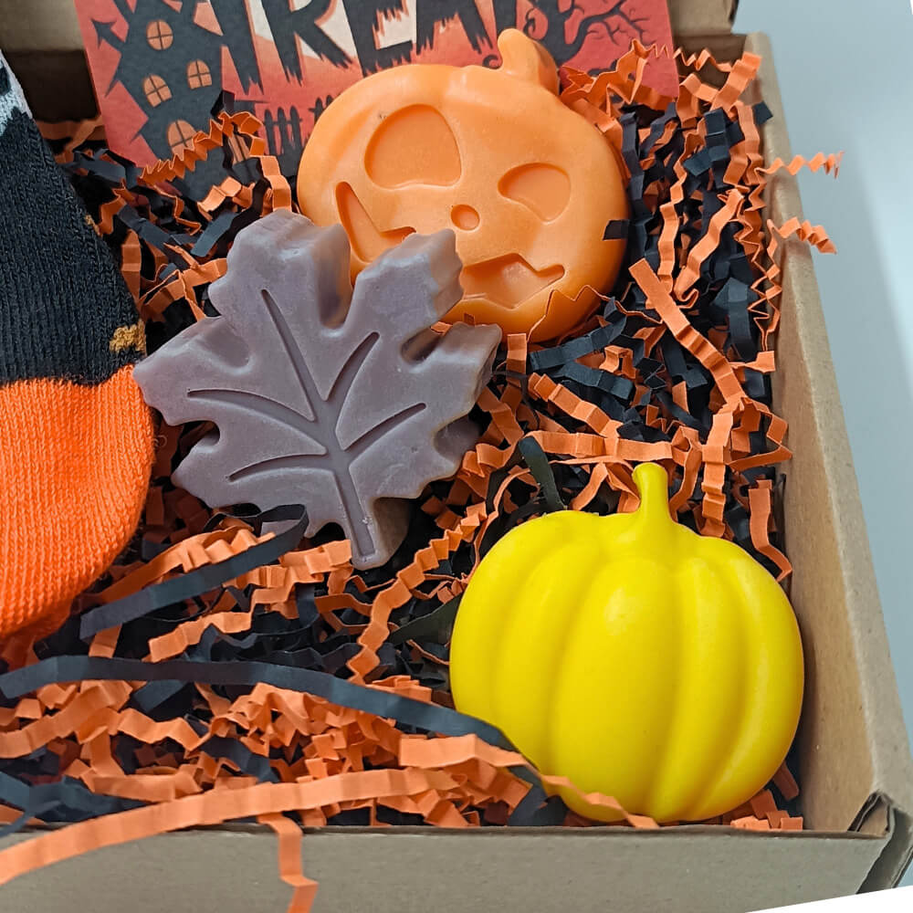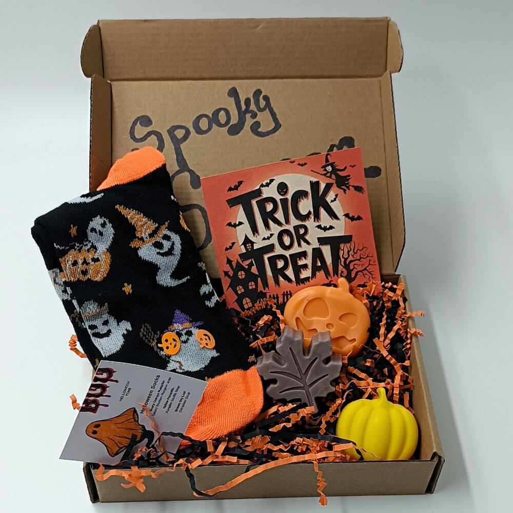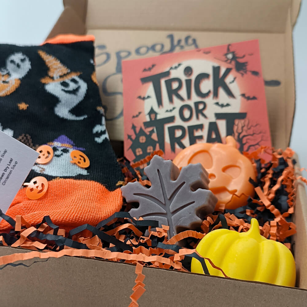 Το Halloween Gift Box Κraft περιλαμβάνει γέμισμα Χάλοουιν, 1 ζευγάρι κάλτσες με τρομακτικά σχέδια, 3 χειροποίητα αρωματικά σαπούνια σε θεματικές μορφές εμπνευσμένες από το Halloween και κάρτα ευχών trick or treat.