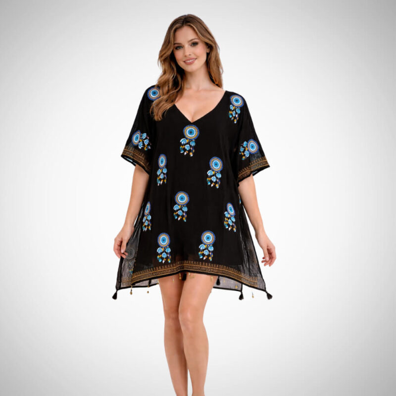 Το κεντητό καφτάνι παραλίας boho διαθέτει χαλαρή, αέρινη γραμμή που αγκαλιάζει το σώμα και προσφέρει απόλυτη ελευθερία κινήσεων. Είναι ιδανικό για να φορεθεί πάνω από το μαγιό στην παραλία, αλλά και για καλοκαιρινές βόλτες στο νησί.