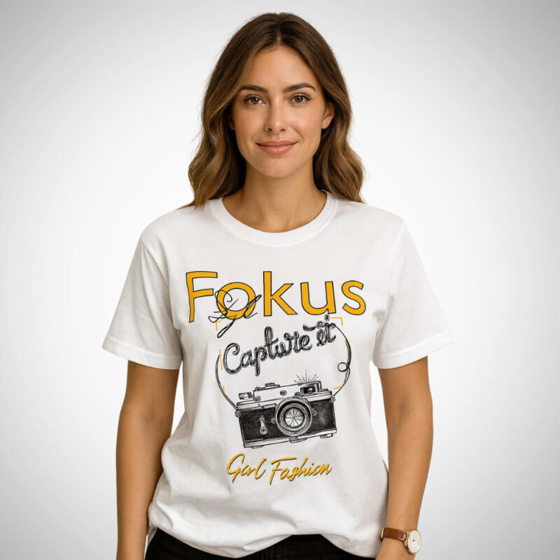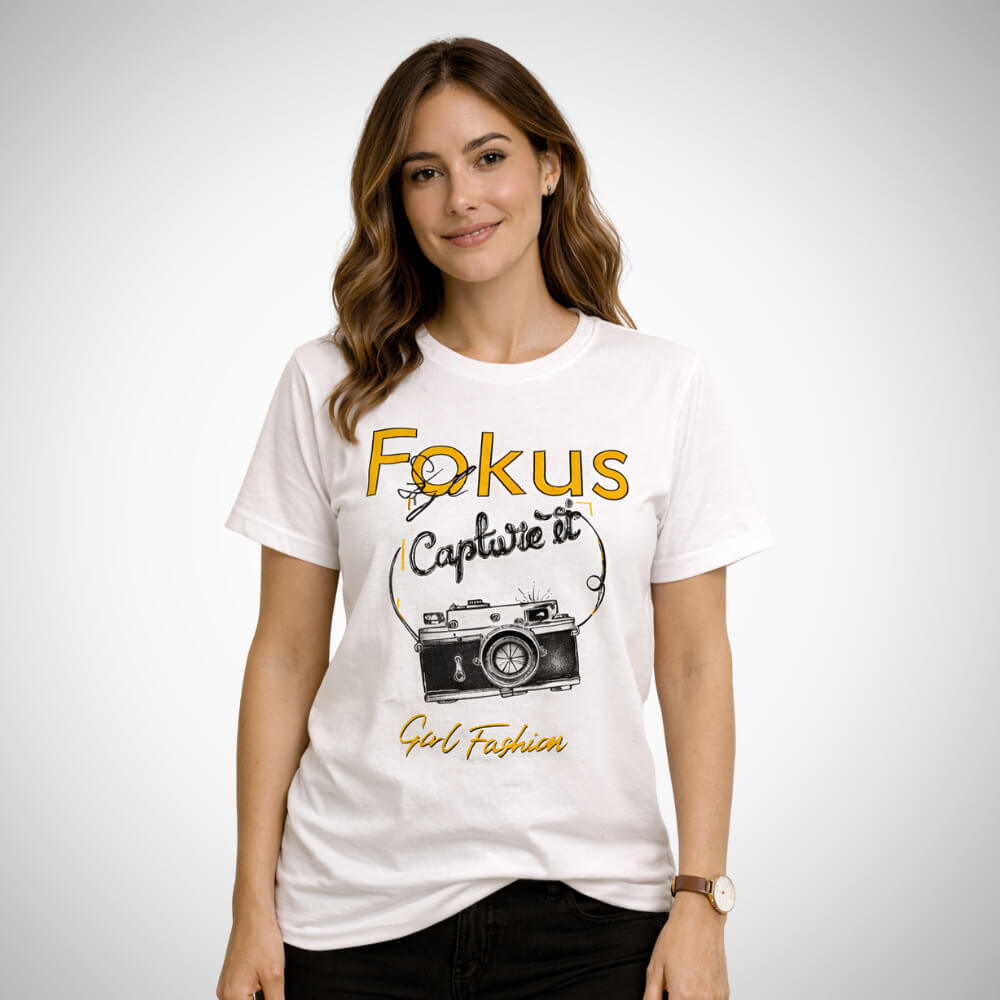 Ανάδειξε το προσωπικό σου στυλ με το γυναικείο T-shirt “Fokus Capture It”, μια μοντέρνα statement μπλούζα εμπνευσμένη από τη φωτογραφία και το urban fashion. Κατασκευασμένο από απαλό βαμβάκι υψηλής ποιότητας, προσφέρει άνετη εφαρμογή και καθημερινή ευκολία.