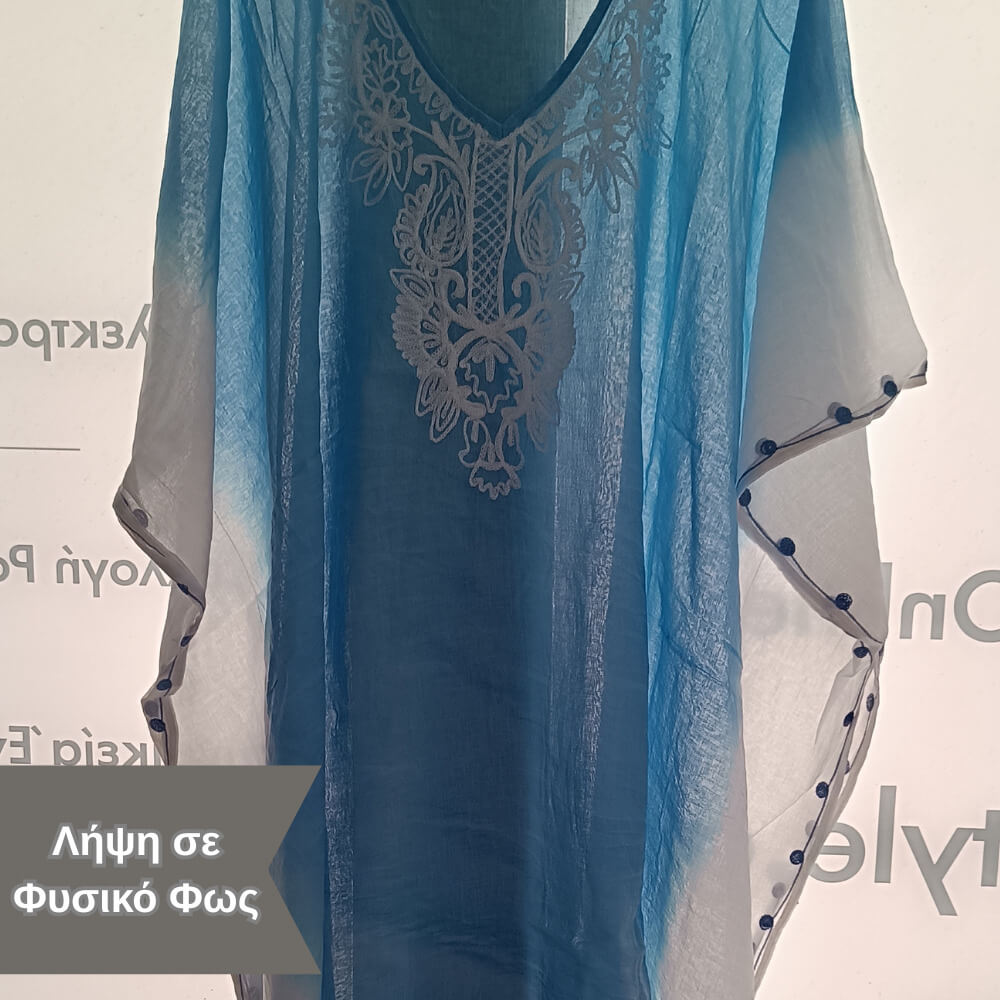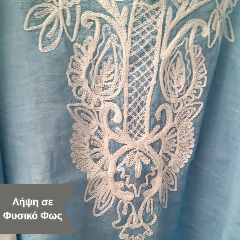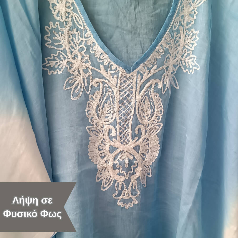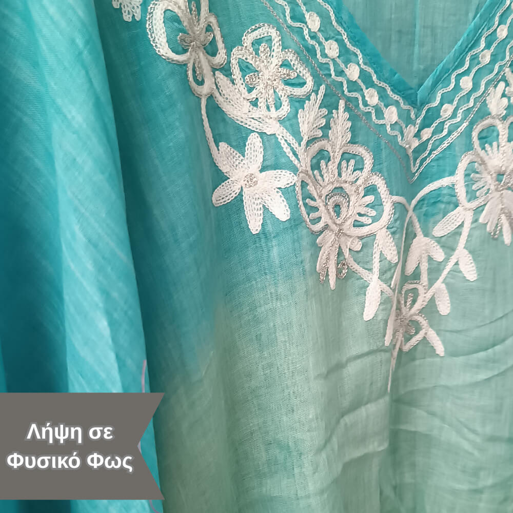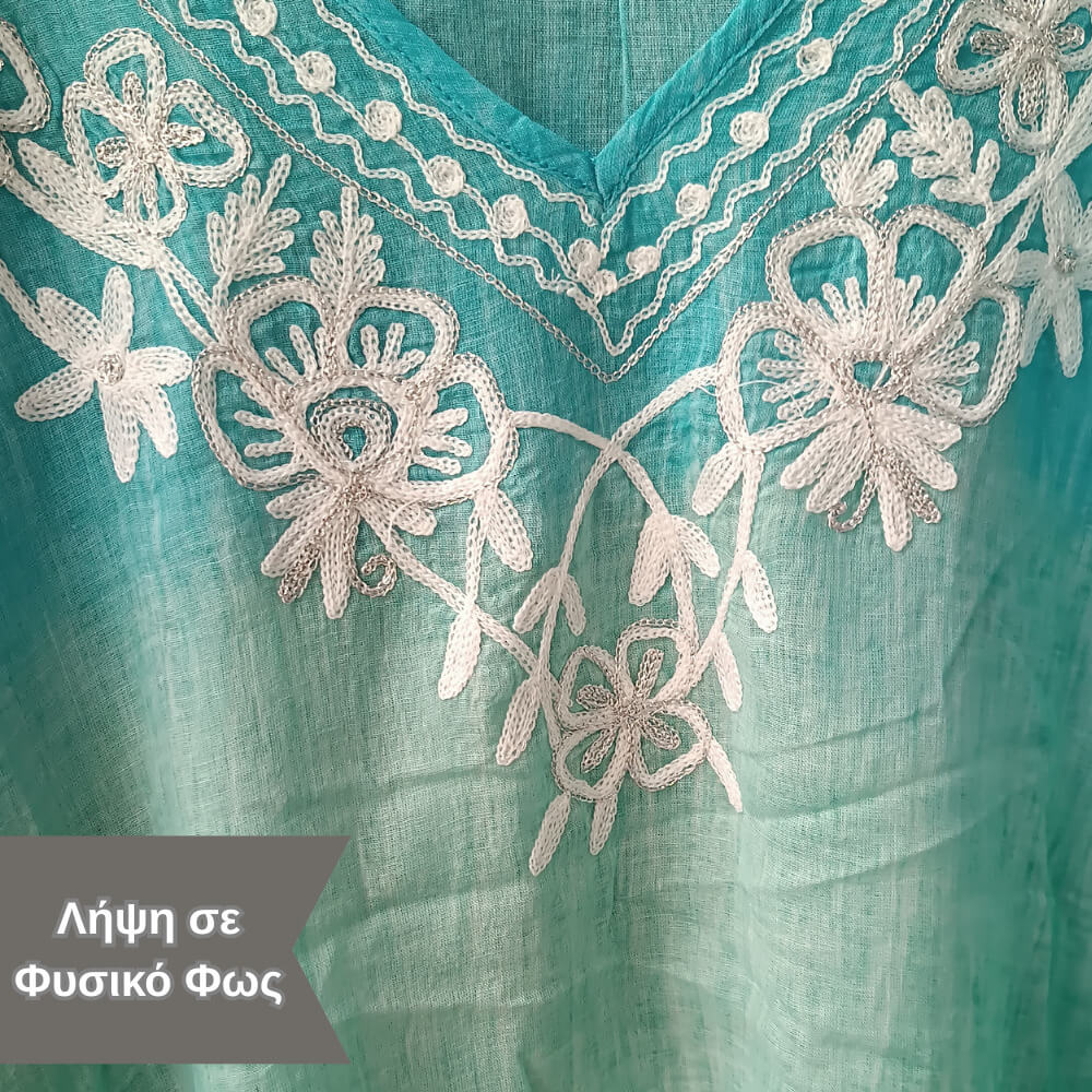 Το ιδιαίτερο κέντημα στο μπροστινό μέρος προσθέτει μία boho αισθητική, ενώ τα διακριτικά φουντάκια στο τελείωμα δίνουν κίνηση και στιλ σε κάθε σου βήμα. Η loose γραμμή του αγκαλιάζει το σώμα χωρίς να περιορίζει, προσφέροντας δροσερή αίσθηση ακόμα και τις πιο ζεστές μέρες.