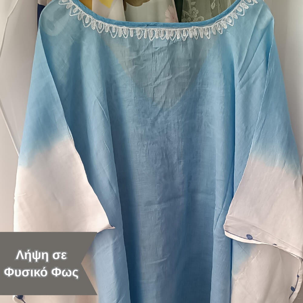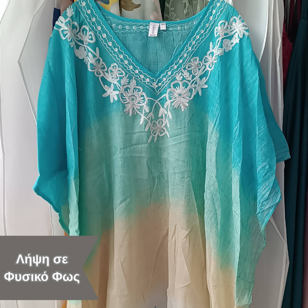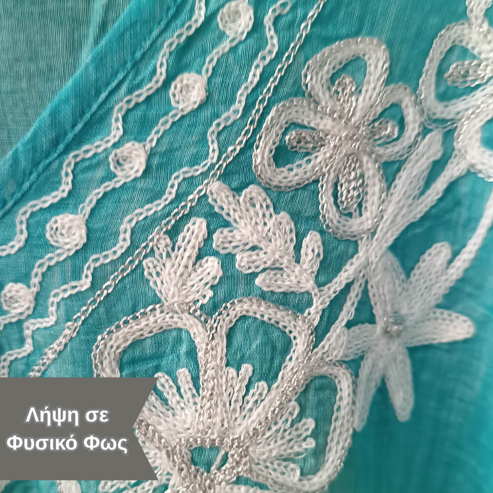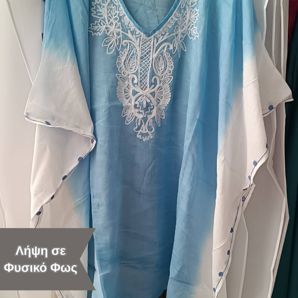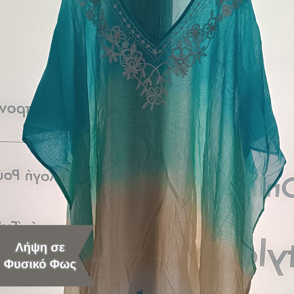 Το ιδιαίτερο κέντημα στο μπροστινό μέρος προσθέτει μία boho αισθητική, ενώ τα διακριτικά φουντάκια στο τελείωμα δίνουν κίνηση και στιλ σε κάθε σου βήμα. Η loose γραμμή του αγκαλιάζει το σώμα χωρίς να περιορίζει, προσφέροντας δροσερή αίσθηση ακόμα και τις πιο ζεστές μέρες.