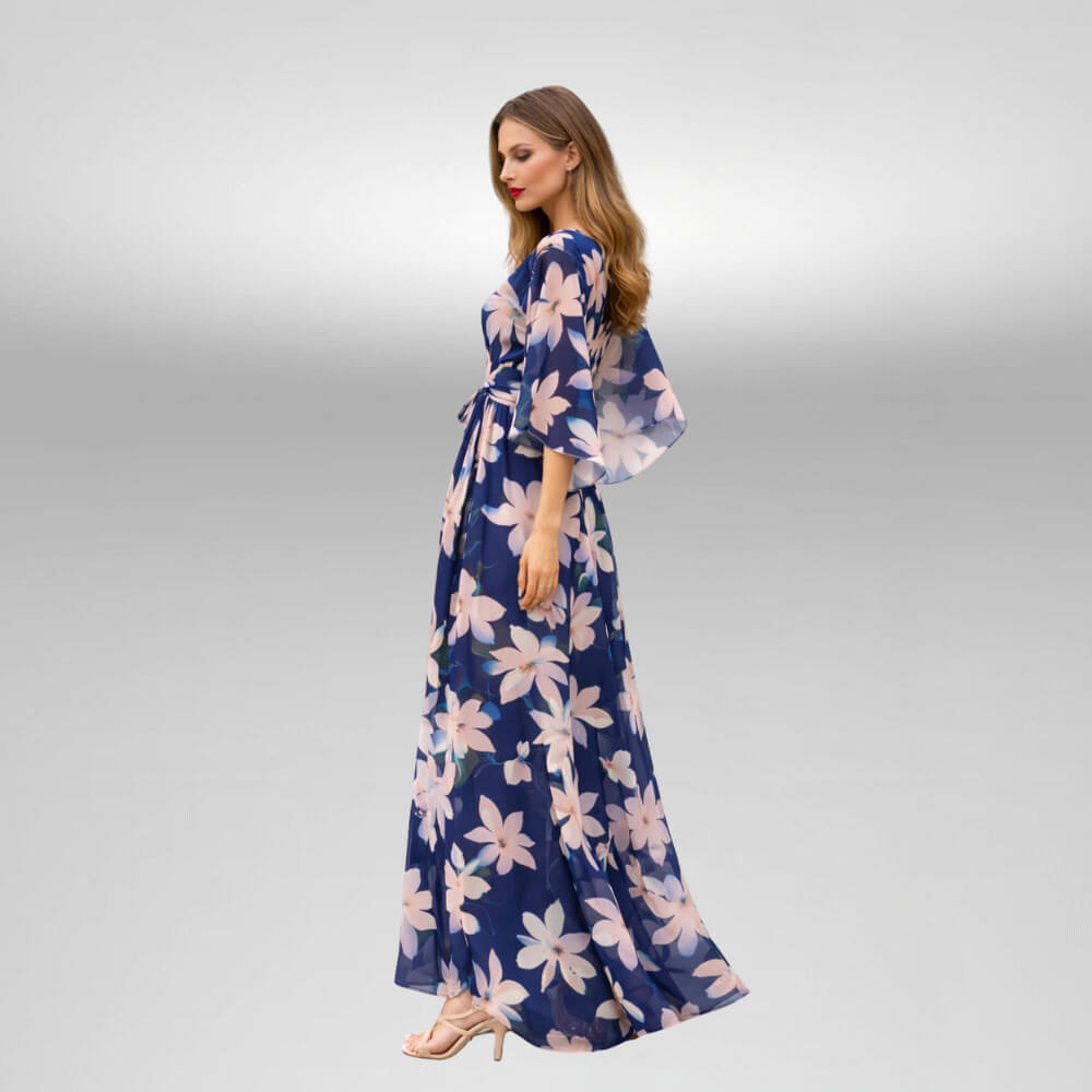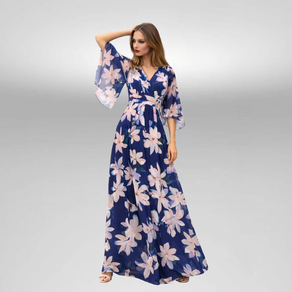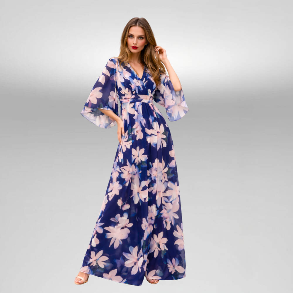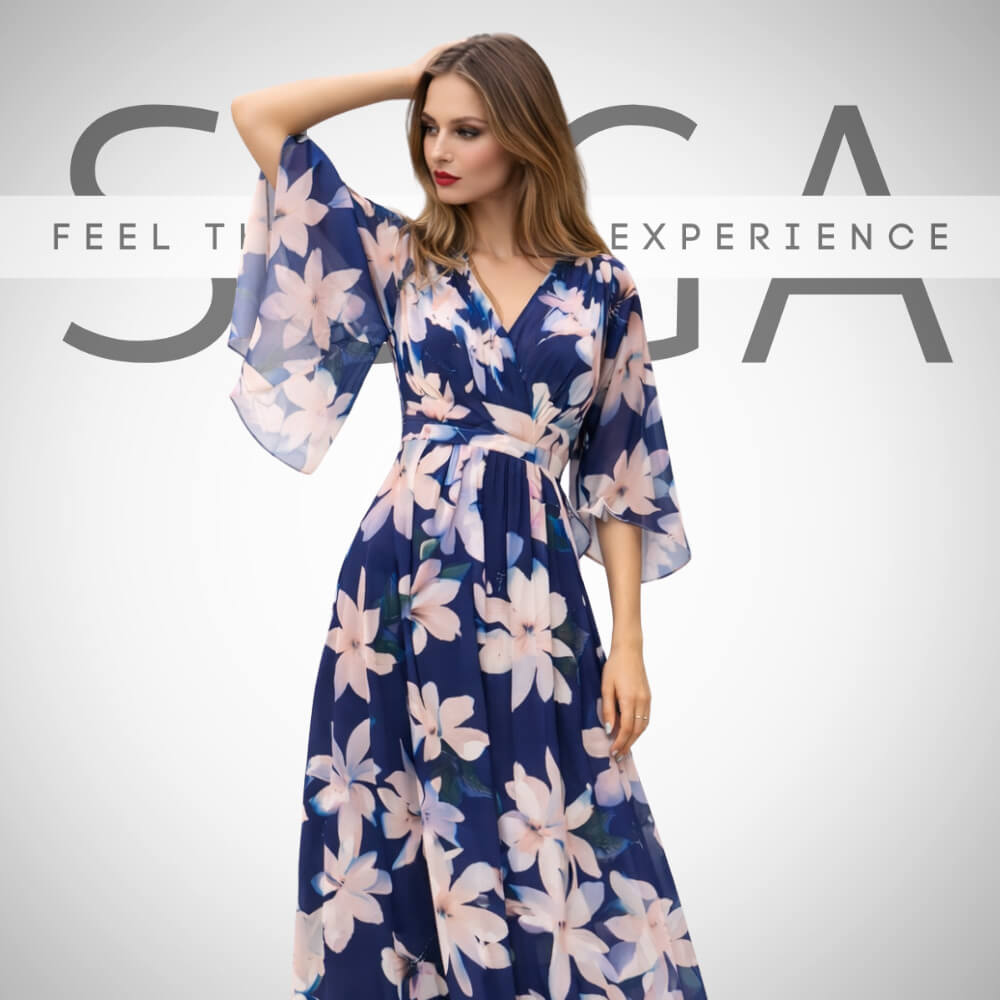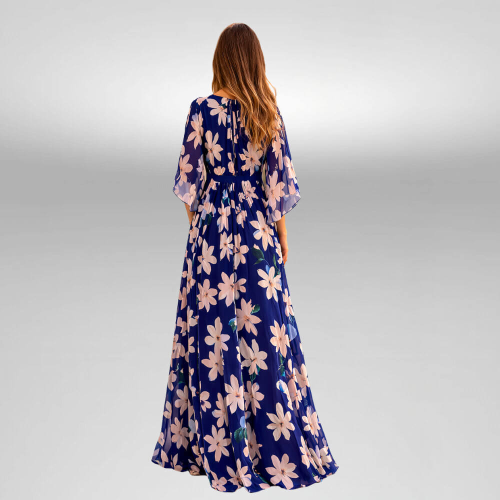 Με το maxi floral μπλε φόρεμα επενδύεις σε ένα κομμάτι που απογειώνει κάθε επίσημη εμφάνιση. Το floral print δίνει ρομαντική αισθητική, ενώ το βαθύ μπλε προσθέτει φινέτσα. Επιπλέον, τα αέρινα διάφανα μανίκια “σπάνε” το κλασικό και κάνουν το look πιο ιδιαίτερο. Έτσι, κρατάς ισορροπία ανάμεσα σε elegant και boho romantic διάθεση.