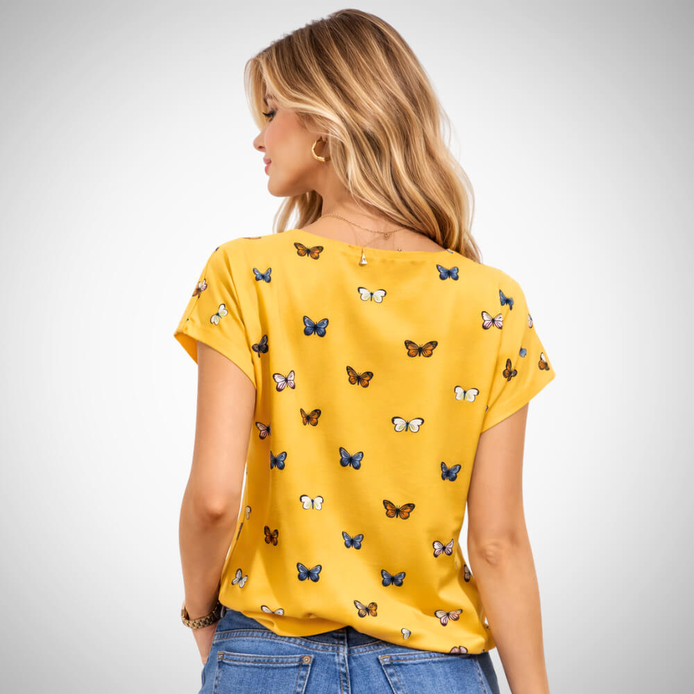 Γυναικεία μπλούζα “Butterfly”. Έχει ανάλαφρη εφαρμογή παρέχοντας άνεση. Το σχέδιο της κολακεύει το σώμα. Ιδανική επιλογή μπλούζας για Άνοιξη ή Καλοκαίρι. Μπορεί να φορεθεί από το πρωί μέχρι το βράδυ και να τη συνδυάσεις με πολλούς τρόπους.