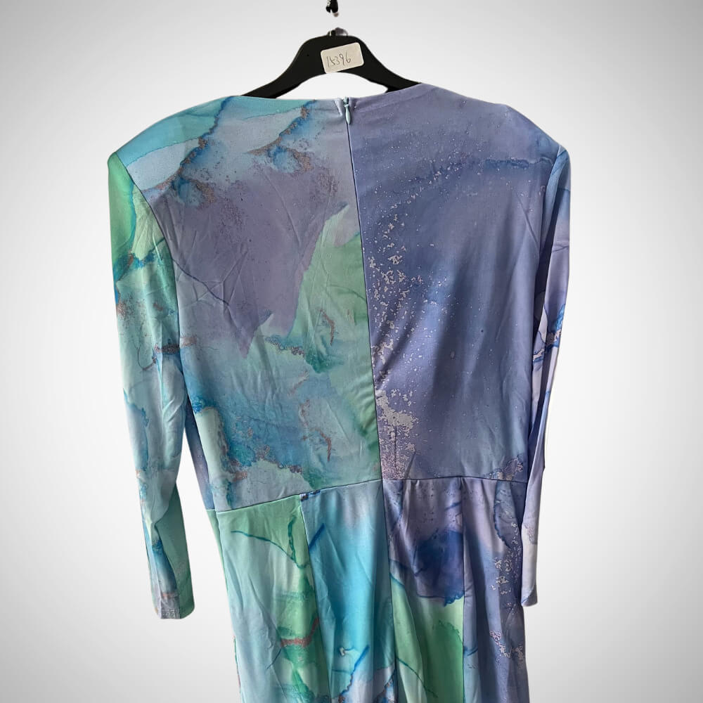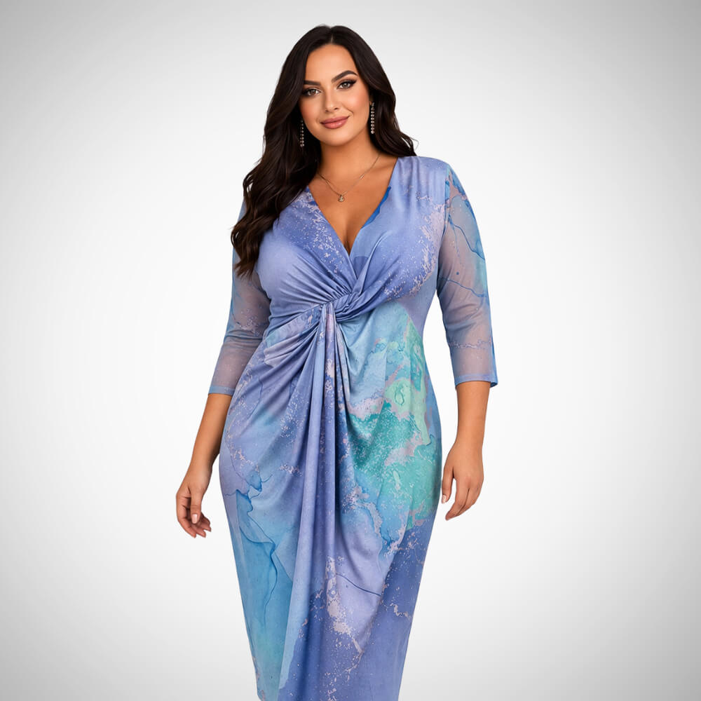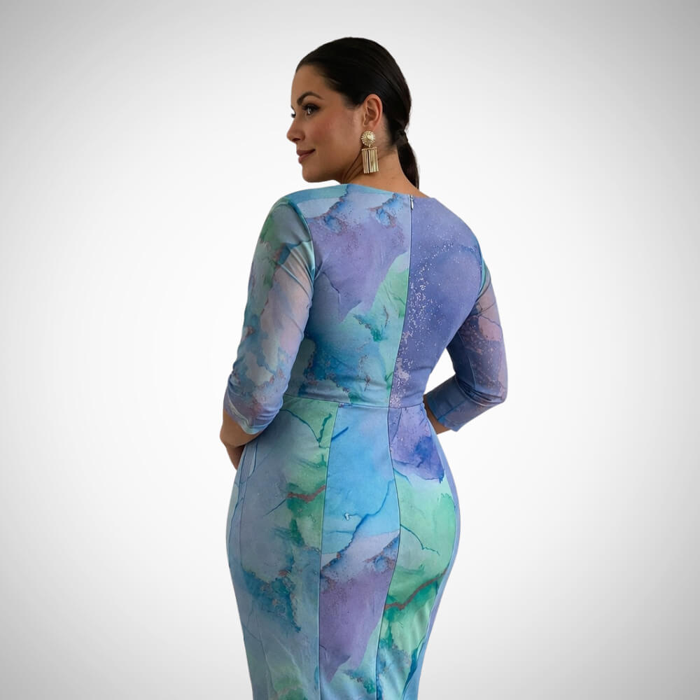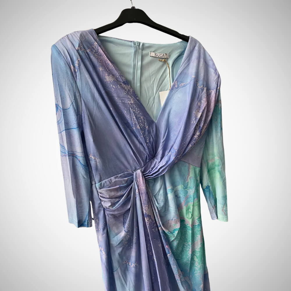 Παράλληλα, ο αέρινος σχεδιασμός και το ανάλαφρο ύφασμα αγκαλιάζουν όμορφα τις καμπύλες και κολακεύουν κάθε σωματότυπο. Επιπλέον, η ελαφριά ελαστικότητα προσφέρει άνεση, ενώ το εντυπωσιακό colormix σε μωβ, λιλά και μπλε διαβαθμίσεις απογειώνει το look. Γι’ αυτό, γίνεται αγαπημένη επιλογή για νονά ή κουμπάρα.