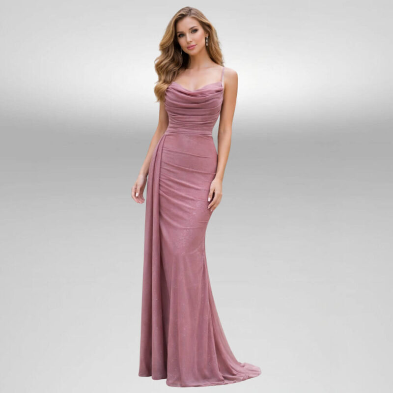 Κάνε statement σε κάθε επίσημη περίσταση με το μακρύ βραδινό φόρεμα σε απόχρωση ροζ μόκα / dusty rose, που αποπνέει ρομαντισμό και διακριτική πολυτέλεια. Το ντραπέ (cowl) ντεκολτέ χαρίζει κομψότητα, ενώ οι λεπτές τιράντες και η εφαρμοστή γραμμή αναδεικνύουν τη σιλουέτα. Η ανάλαφρη κίνηση στο κάτω μέρος και η απαλή λάμψη του υφάσματος το κάνουν ιδανικό για γάμο, βάπτιση, δεξίωση, αρραβώνα ή gala. Το ύφασμα του είναι αέρινο για να αναδεικνύει τις καμπύλες στα σωστά σημεία ενώ το σχέδιο του είναι μοναδικό όπως και το χρώμα του που έχει διακριτικά στρας σε όλο το φόρεμα χωρίς να γίνεται υπερβολικό.