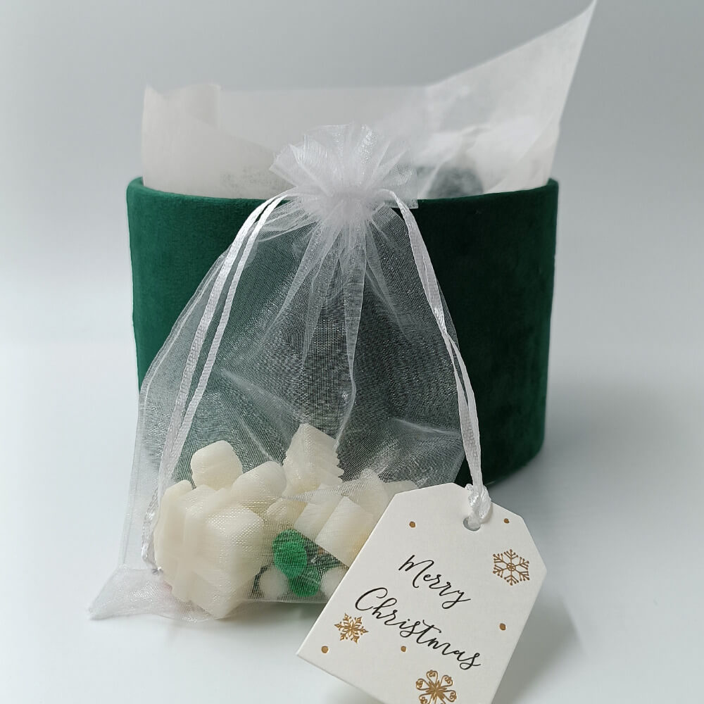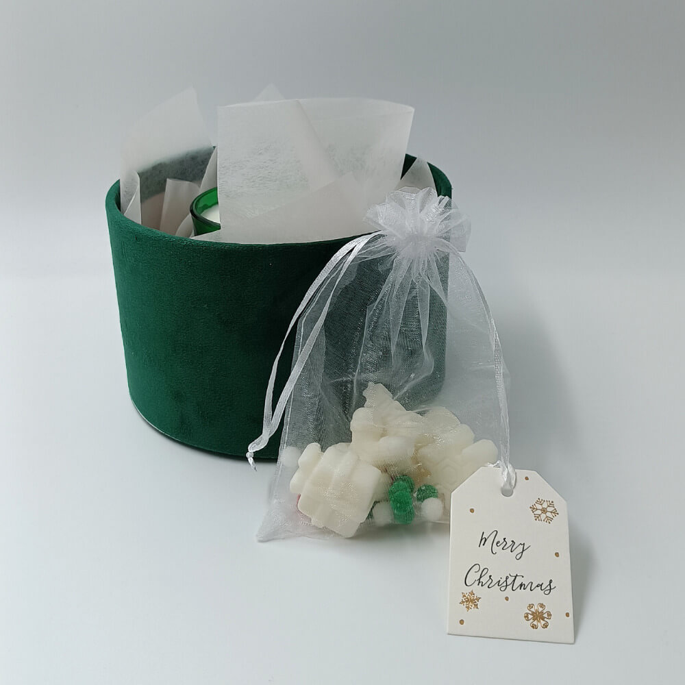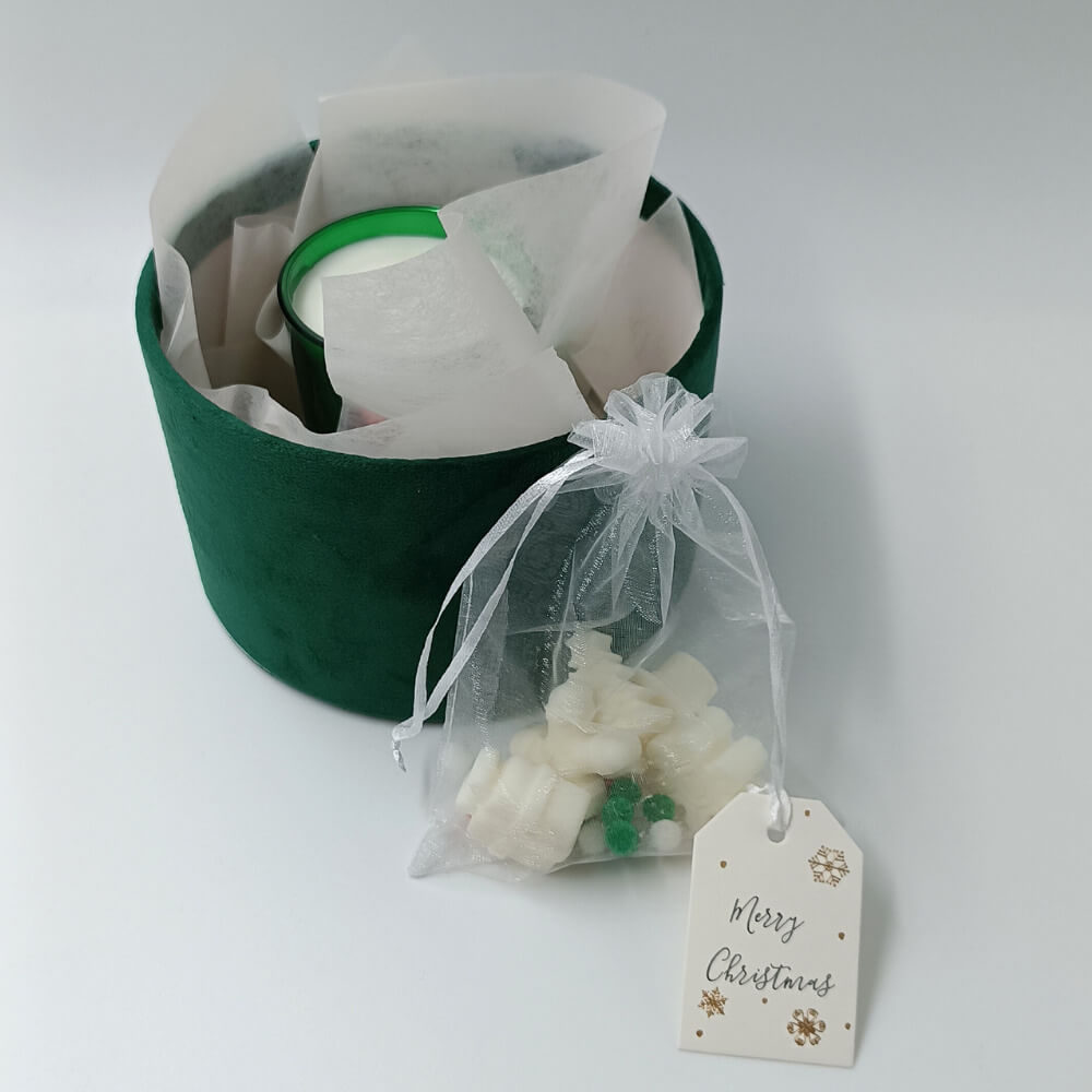 Το σετ ολοκληρώνεται με 5 χριστουγεννιάτικα wax melts σε εορταστικά σχέδια, με άρωμα spiced bourbon pumpkin, τοποθετημένα σε λευκό οργάντζα πουγκί με εορταστικές χρωματιστές μπάλες. Το κουτί είναι διακοσμημένο εσωτερικά με τρία ροζ παστέλ ρυζόχαρτα, ενώ περιλαμβάνει και ένα κομψό καρτελάκι “Merry Christmas”, καθιστώντας το δώρο έτοιμο για να το χαρίσετε στα αγαπημένα σας πρόσωπα.