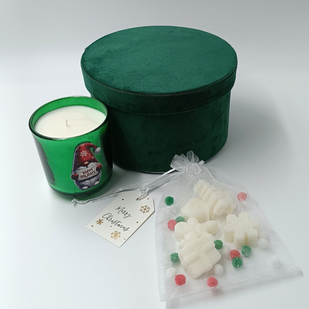 Στο εσωτερικό του θα βρείτε ένα αρωματικό κερί 280ml σε glossy πράσινο γυάλινο δοχείο, διακοσμημένο με χριστουγεννιάτικο gnome και τη φράση “Happy Holidays”. Το κερί είναι φτιαγμένο από μαλακό κερί υψηλής ποιότητας και διαθέτει έντονο άρωμα ζεστού γλυκού κρασιού, ιδανικό για ατμοσφαιρικές στιγμές τις κρύες μέρες των γιορτών.