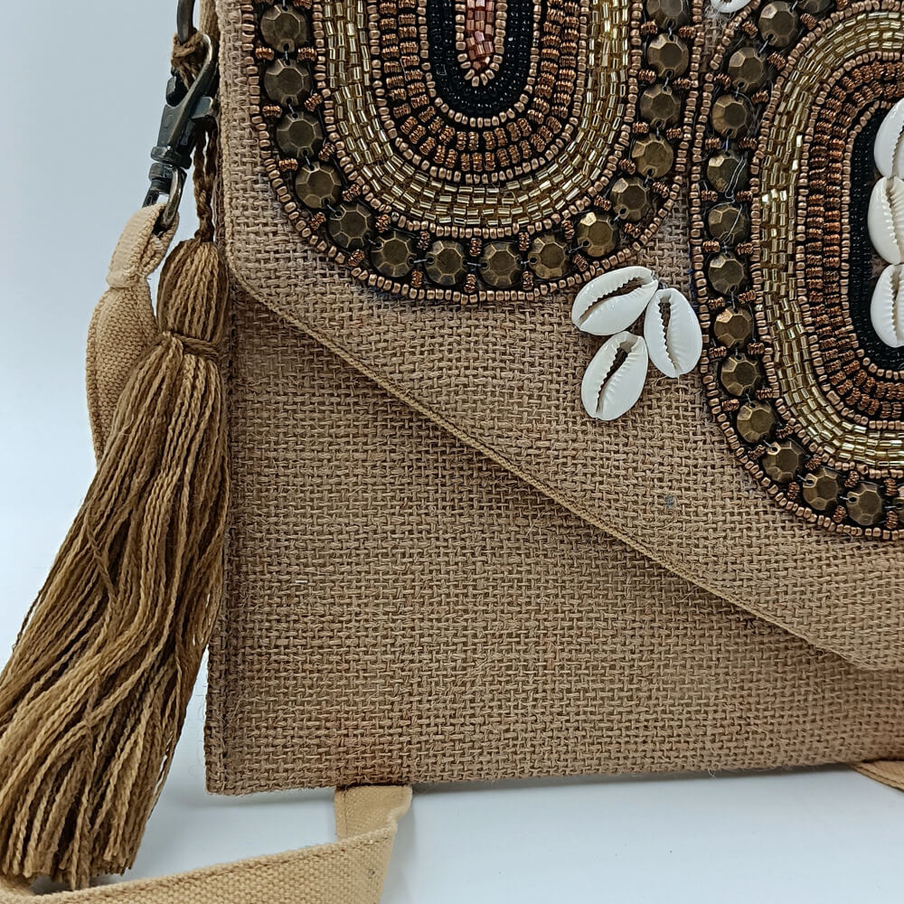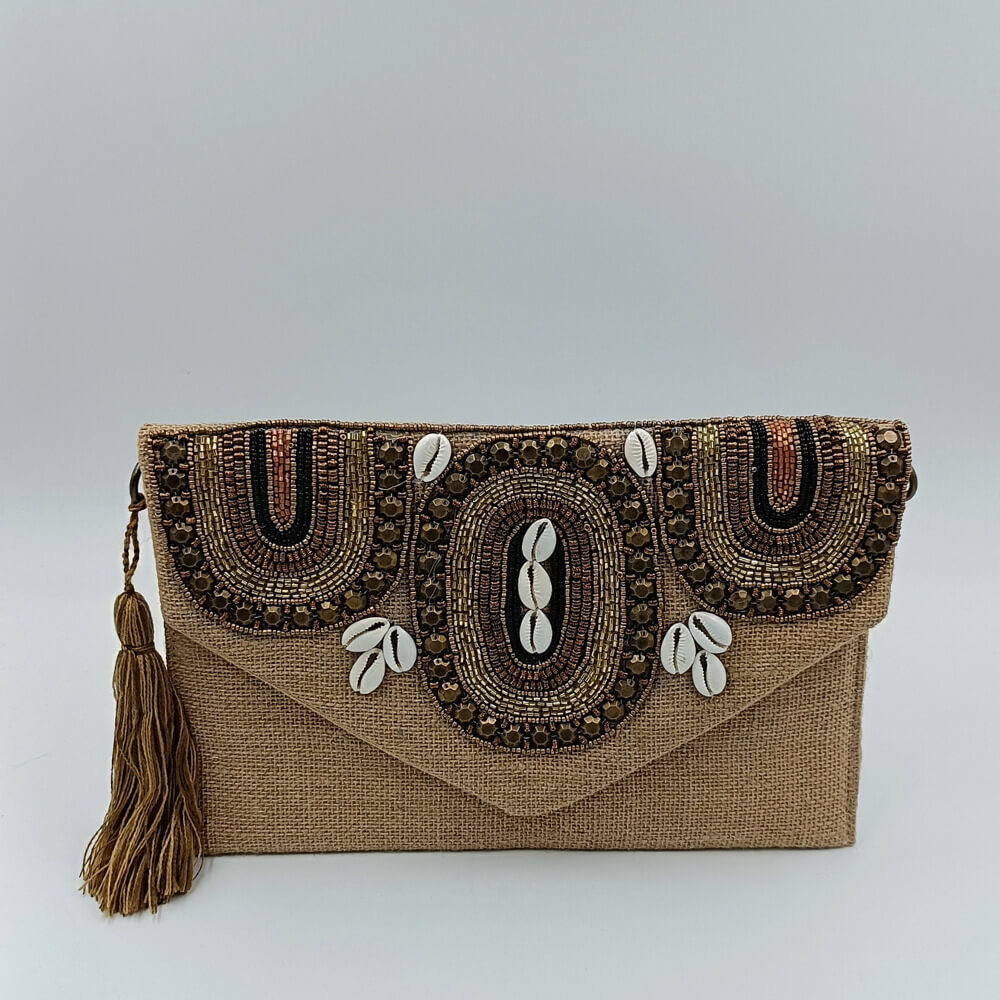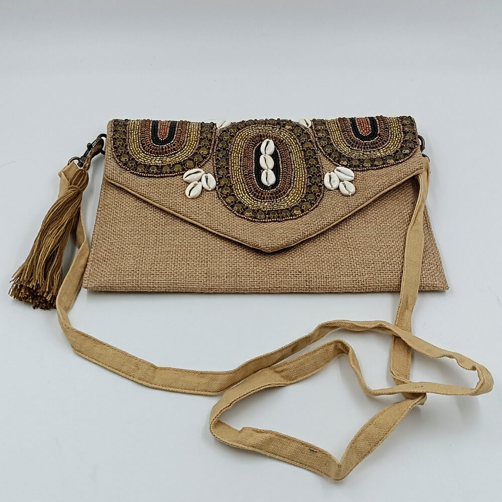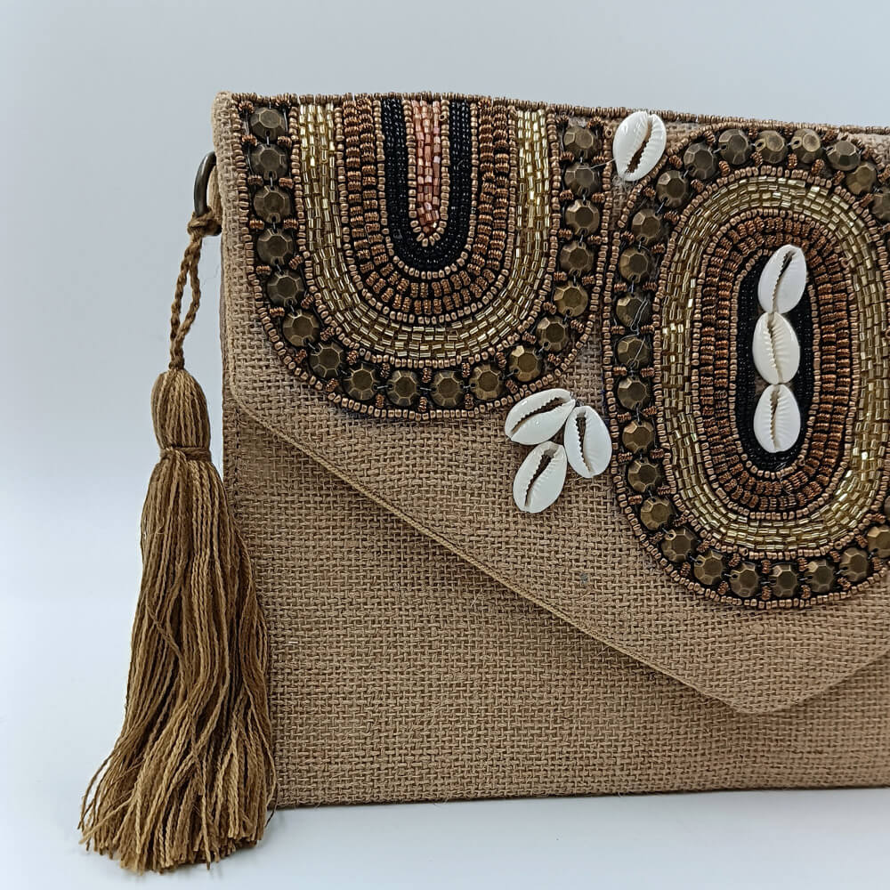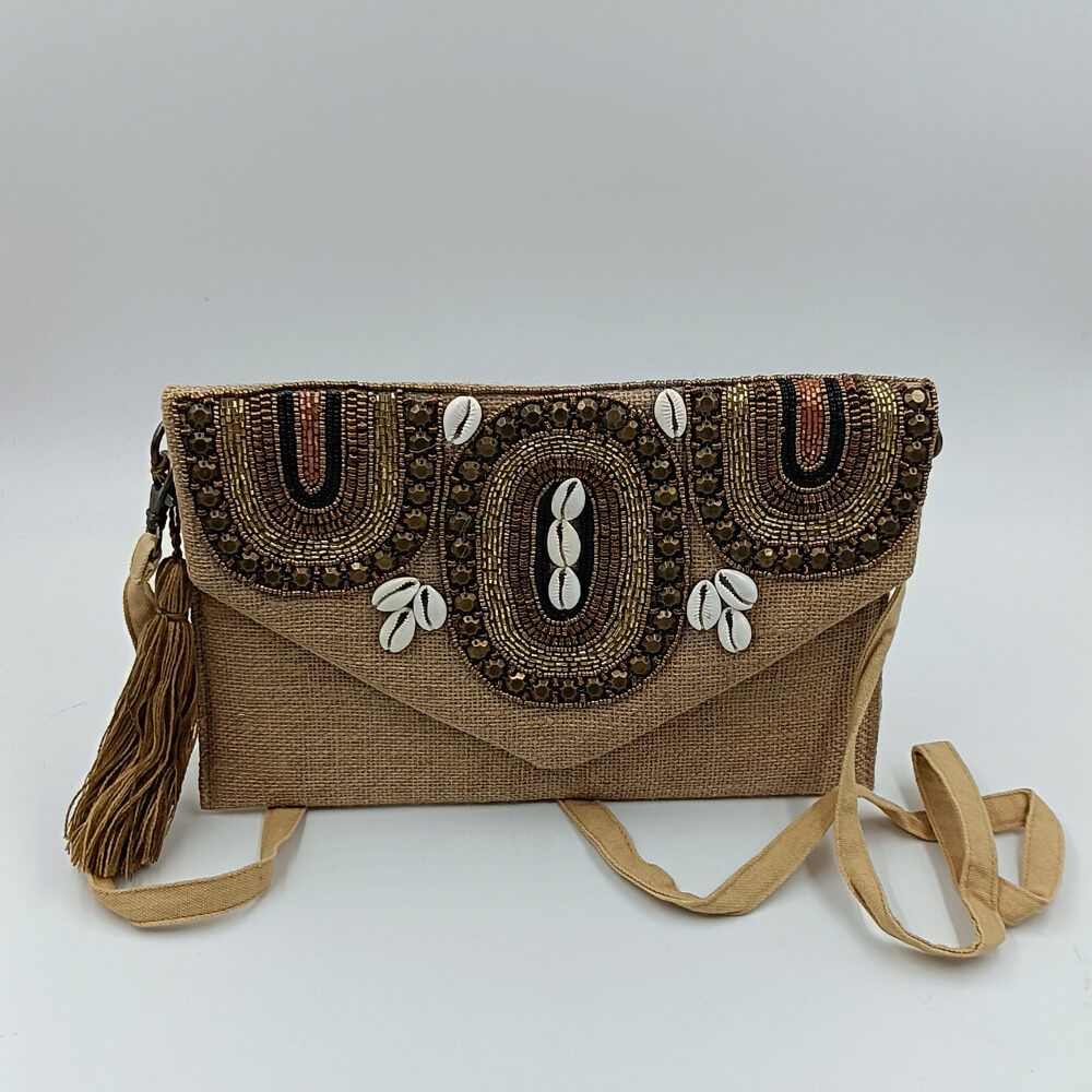Η μπεζ λινάτσα συνδυάζεται όμορφα με τις χάντρες, τα κοχύλια και τη φούντα. Το αποτέλεσμα είναι κομψό, καλοκαιρινό και πολύ ξεχωριστό. Ο σχεδιασμός της σε στιλ φακέλου την κάνει πρακτική και ευκολοφόρετη.
