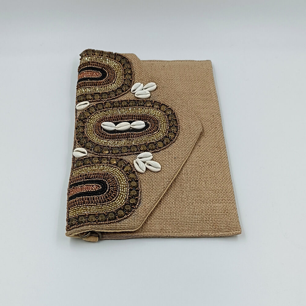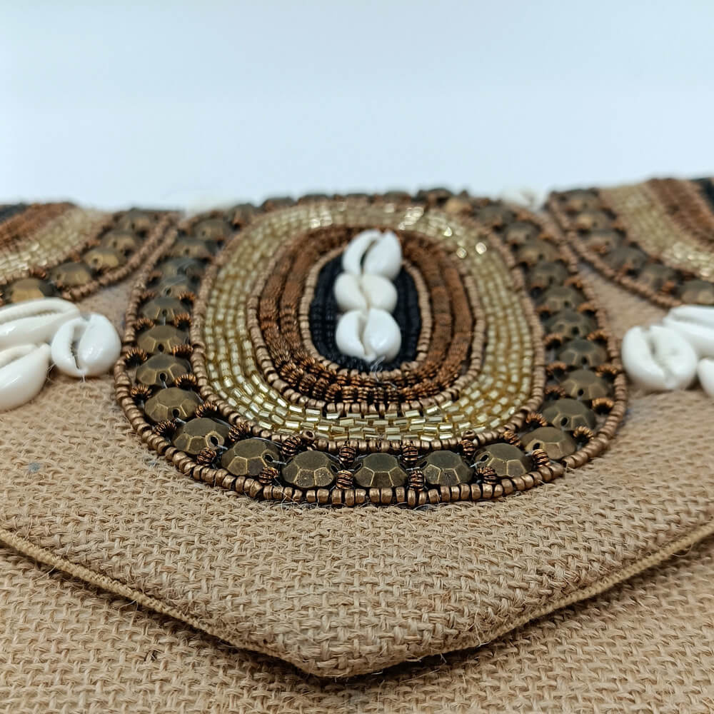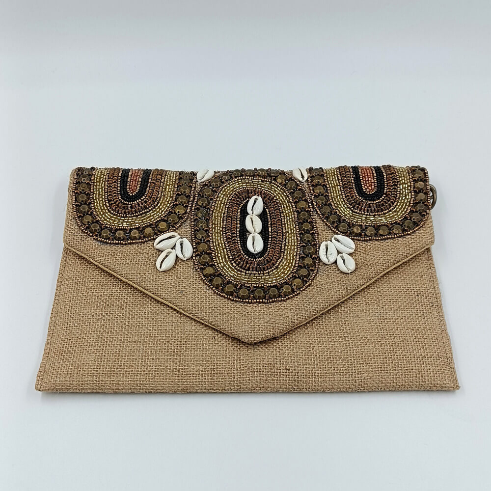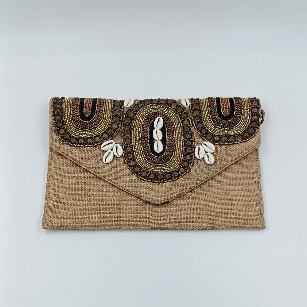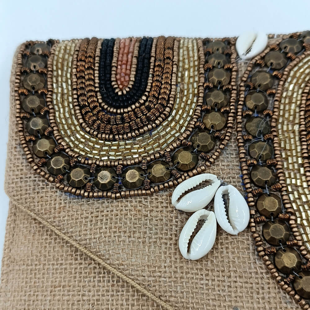 Η μπεζ λινάτσα συνδυάζεται όμορφα με τις χάντρες, τα κοχύλια και τη φούντα. Το αποτέλεσμα είναι κομψό, καλοκαιρινό και πολύ ξεχωριστό. Ο σχεδιασμός της σε στιλ φακέλου την κάνει πρακτική και ευκολοφόρετη.