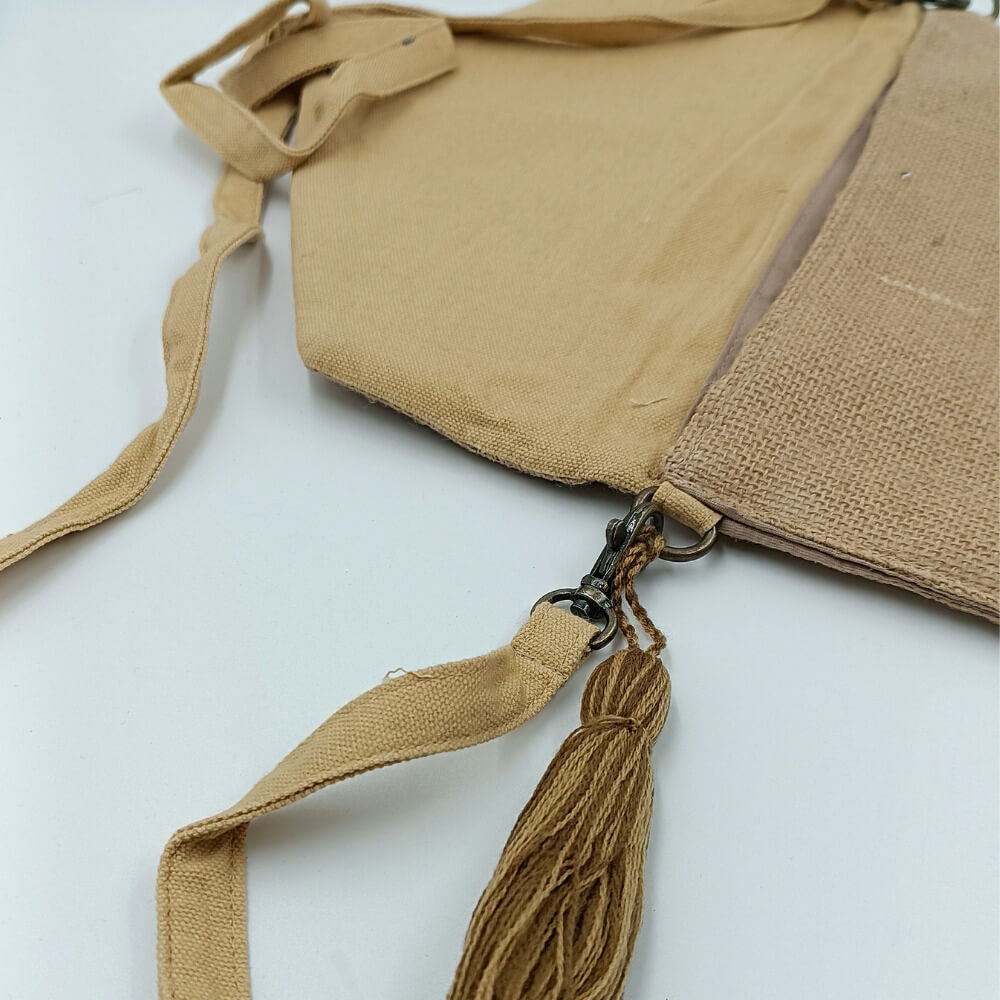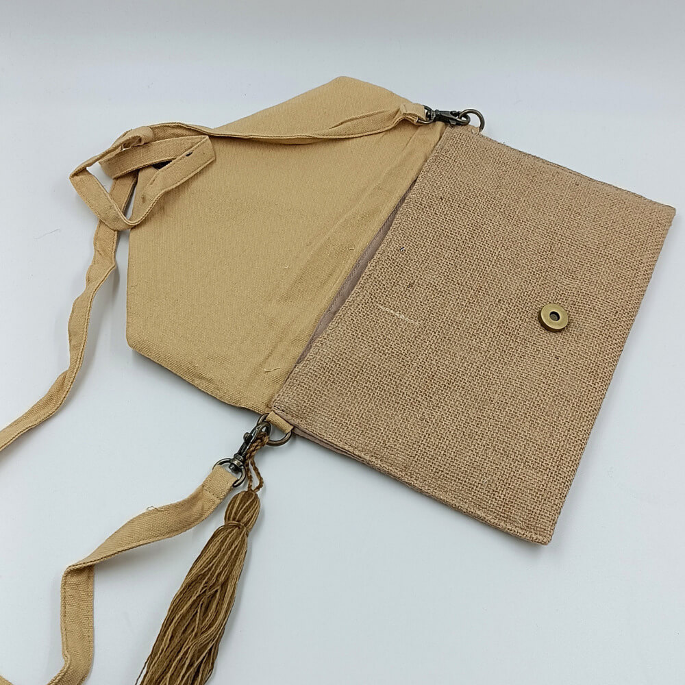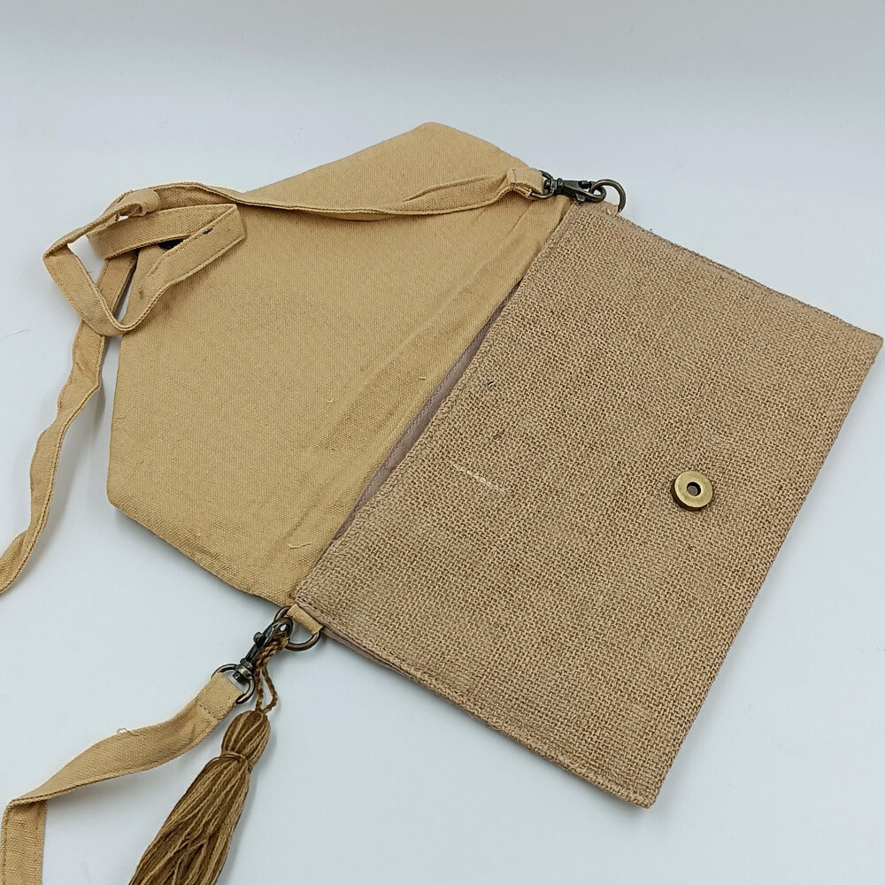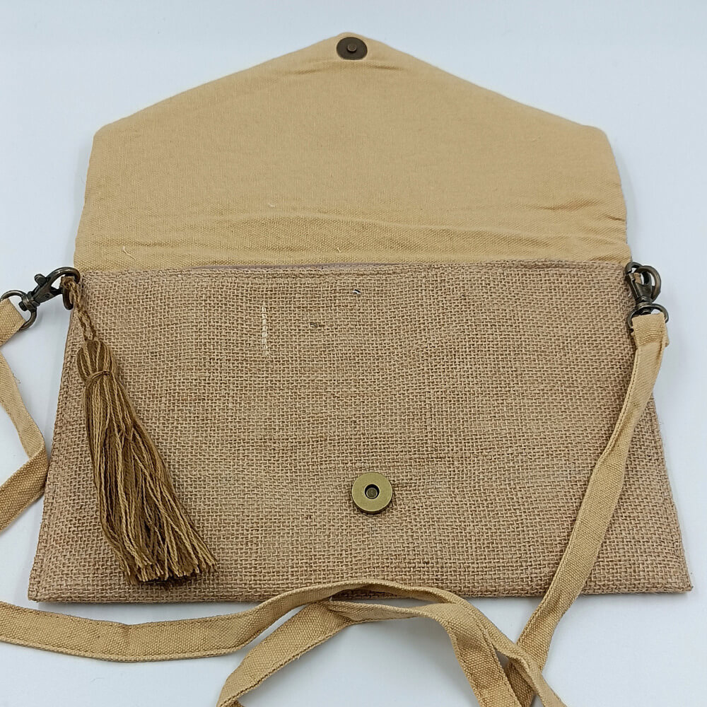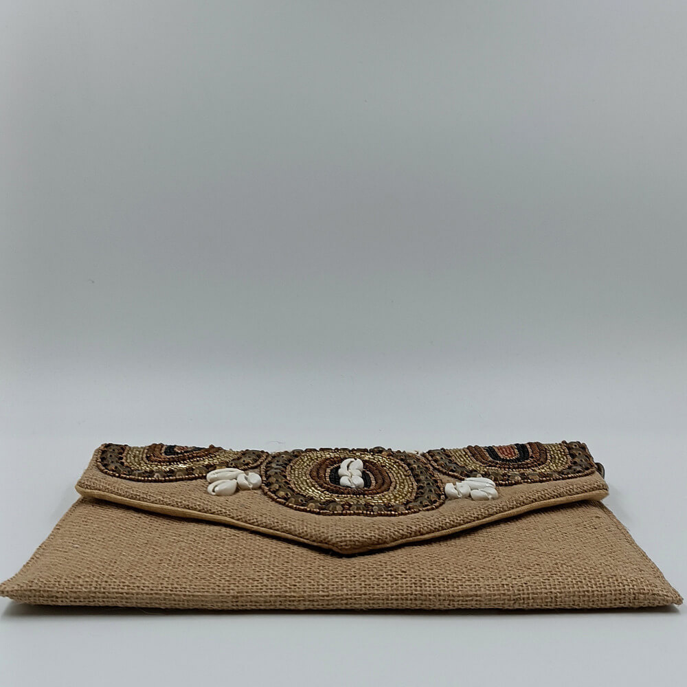 Η μπεζ λινάτσα συνδυάζεται όμορφα με τις χάντρες, τα κοχύλια και τη φούντα. Το αποτέλεσμα είναι κομψό, καλοκαιρινό και πολύ ξεχωριστό. Ο σχεδιασμός της σε στιλ φακέλου την κάνει πρακτική και ευκολοφόρετη.