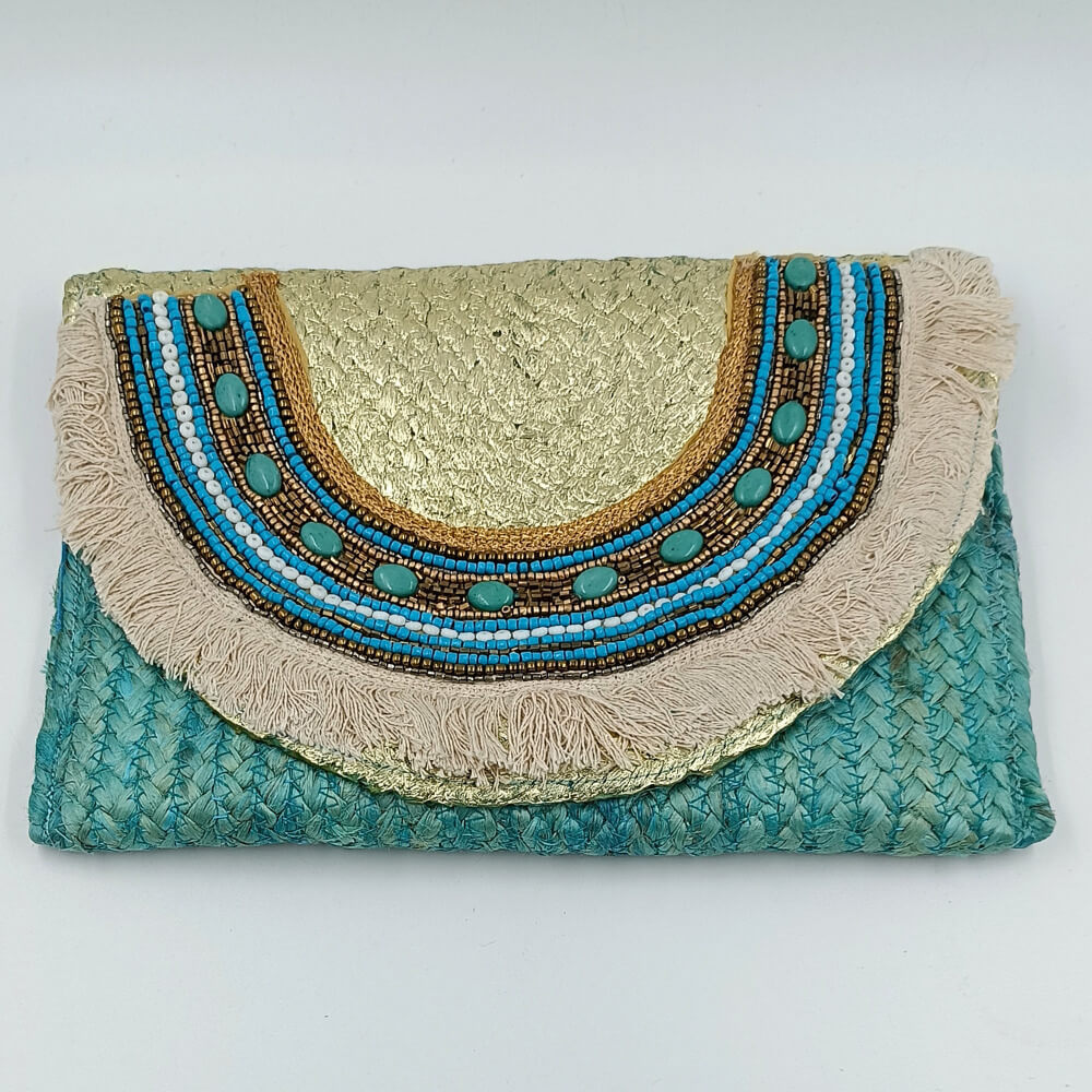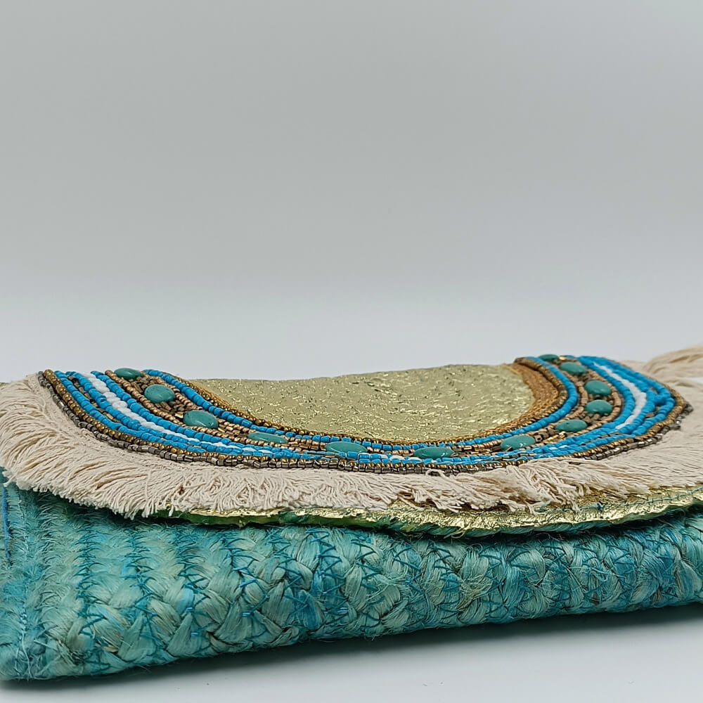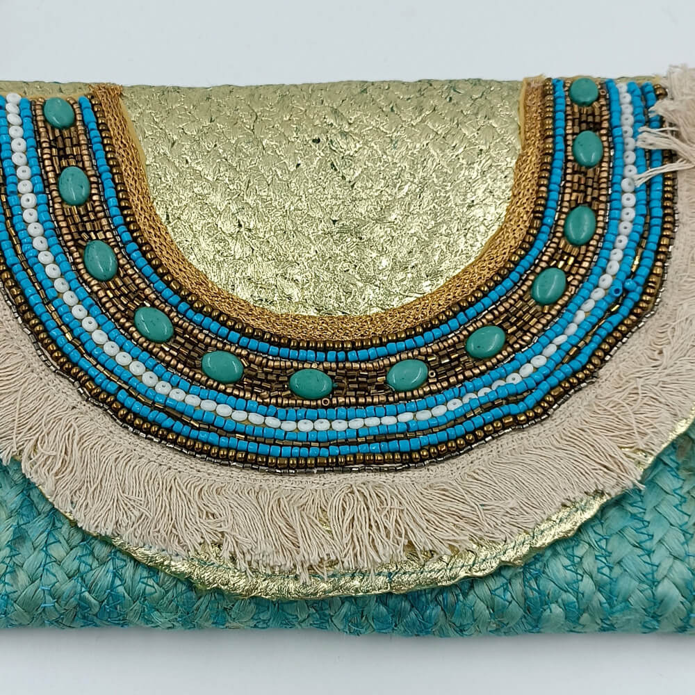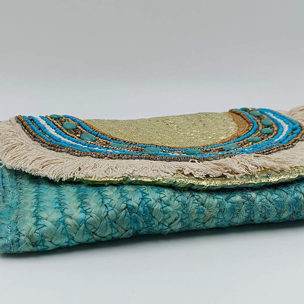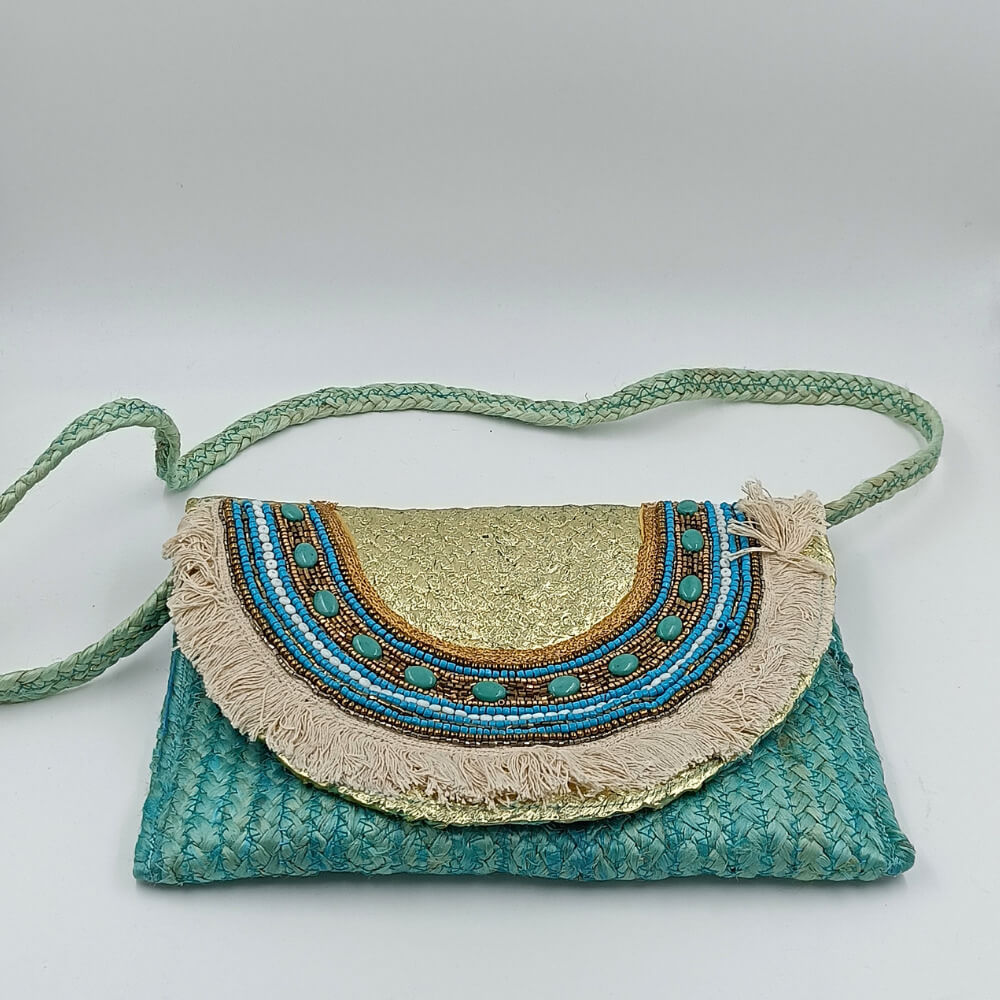 Η ψάθινη υφή σε τιρκουάζ απόχρωση δίνει φρεσκάδα και καλοκαιρινό ύφος. Η διακόσμηση με χάντρες σε αποχρώσεις του μπλε, του λευκού και του χρυσού δημιουργεί ένα εντυπωσιακό ethnic αποτέλεσμα. Τα κρόσια προσθέτουν κίνηση και αυθεντικό boho στιλ.