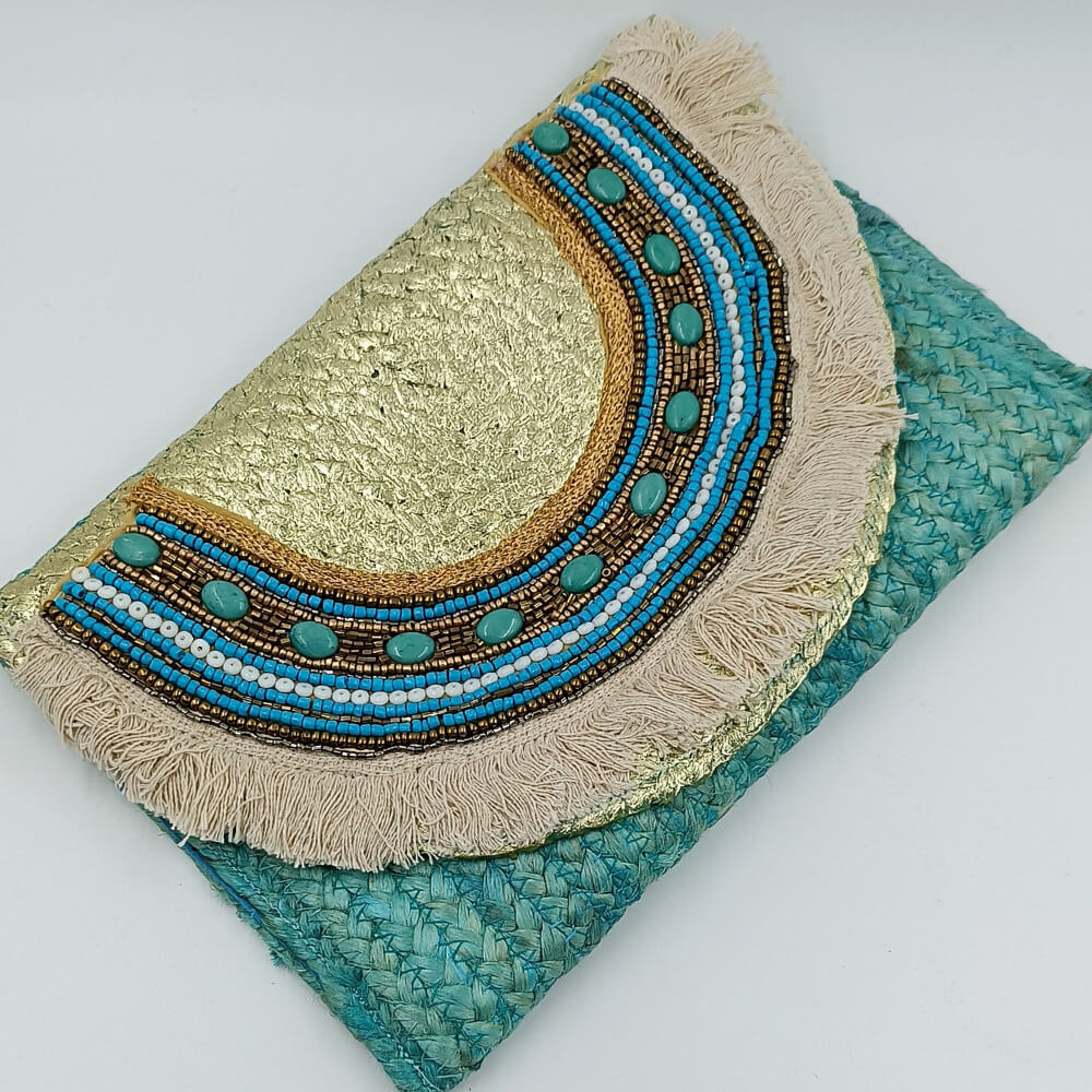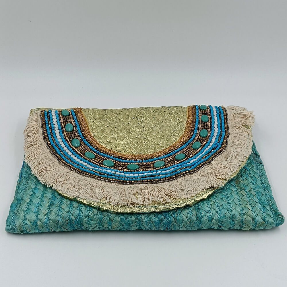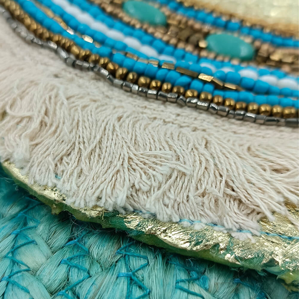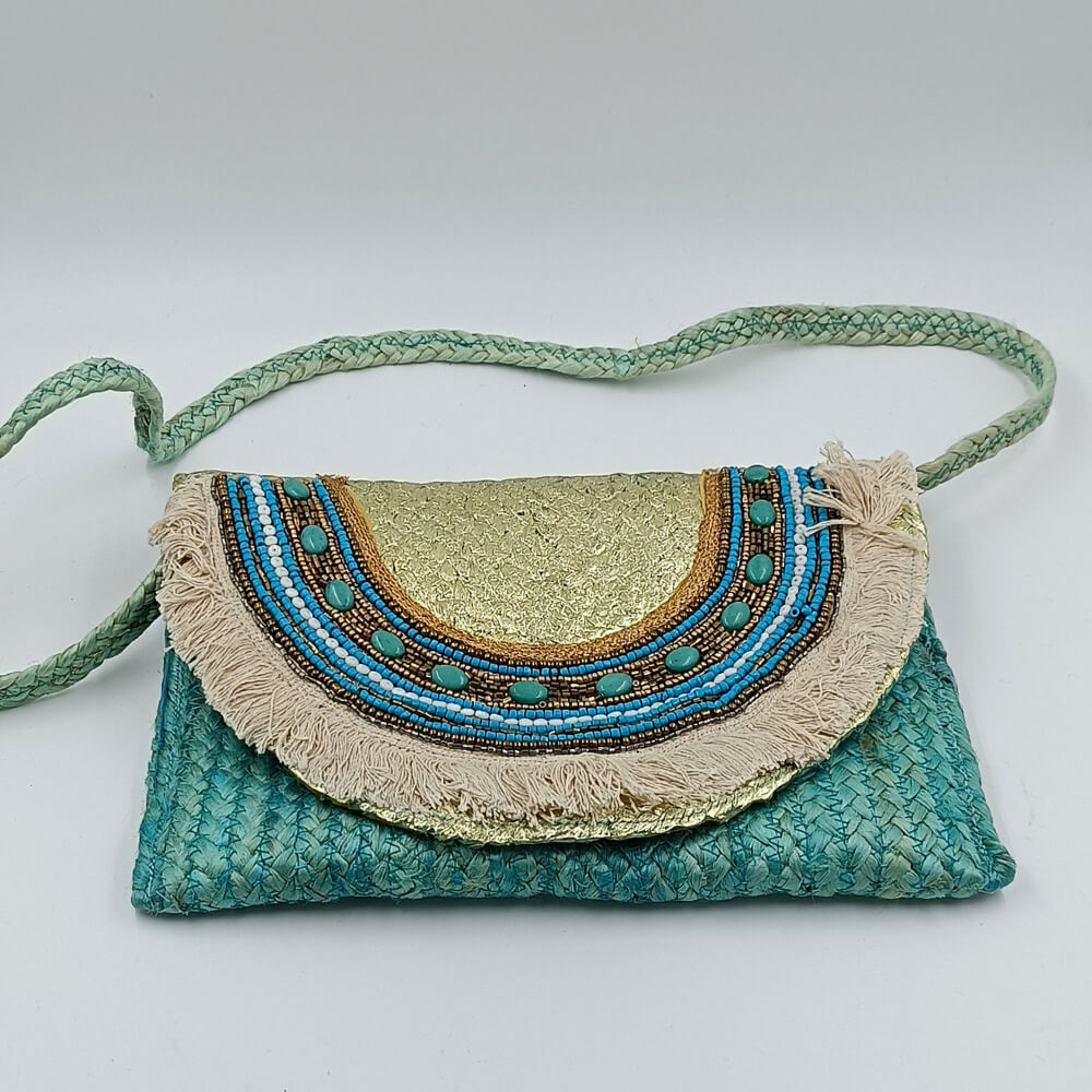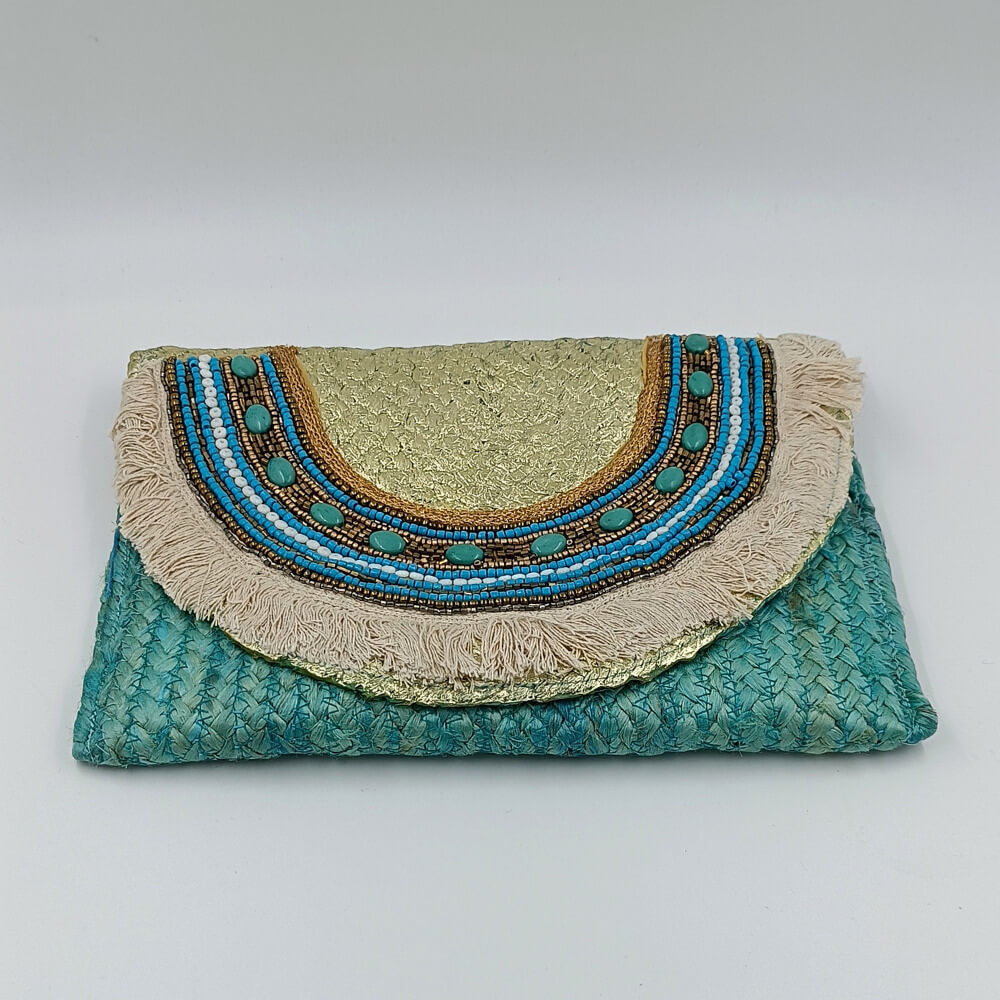 Η ψάθινη υφή σε τιρκουάζ απόχρωση δίνει φρεσκάδα και καλοκαιρινό ύφος. Η διακόσμηση με χάντρες σε αποχρώσεις του μπλε, του λευκού και του χρυσού δημιουργεί ένα εντυπωσιακό ethnic αποτέλεσμα. Τα κρόσια προσθέτουν κίνηση και αυθεντικό boho στιλ.
