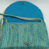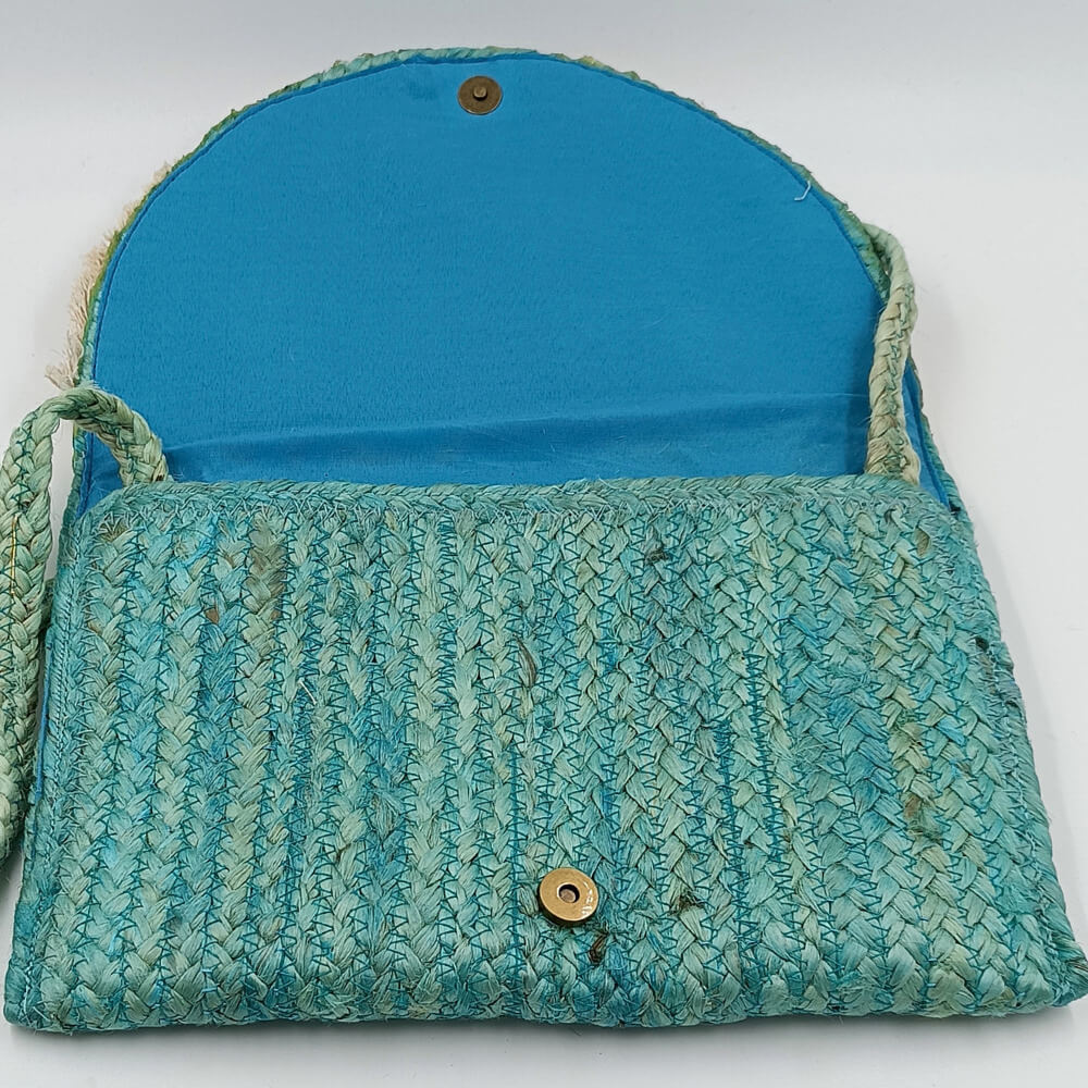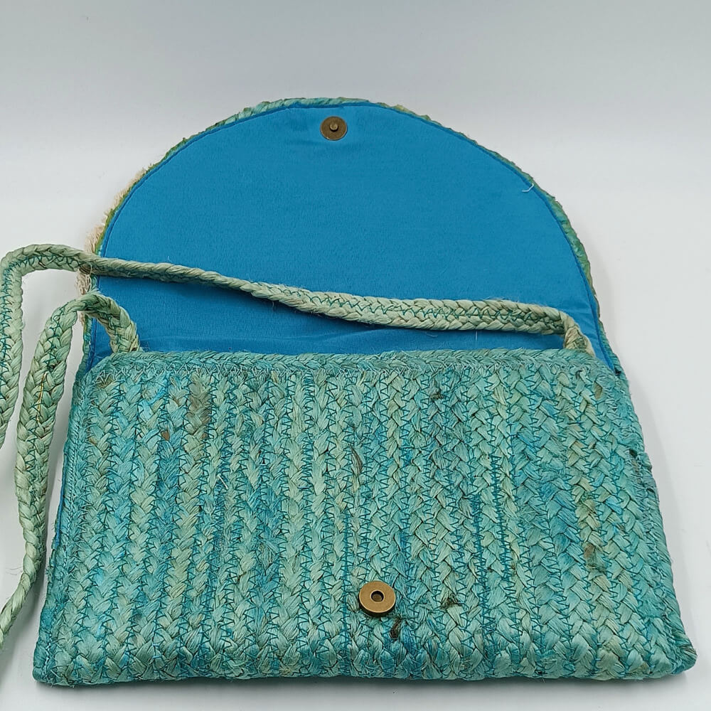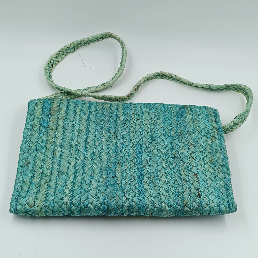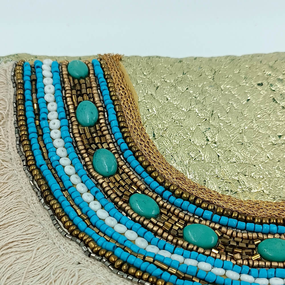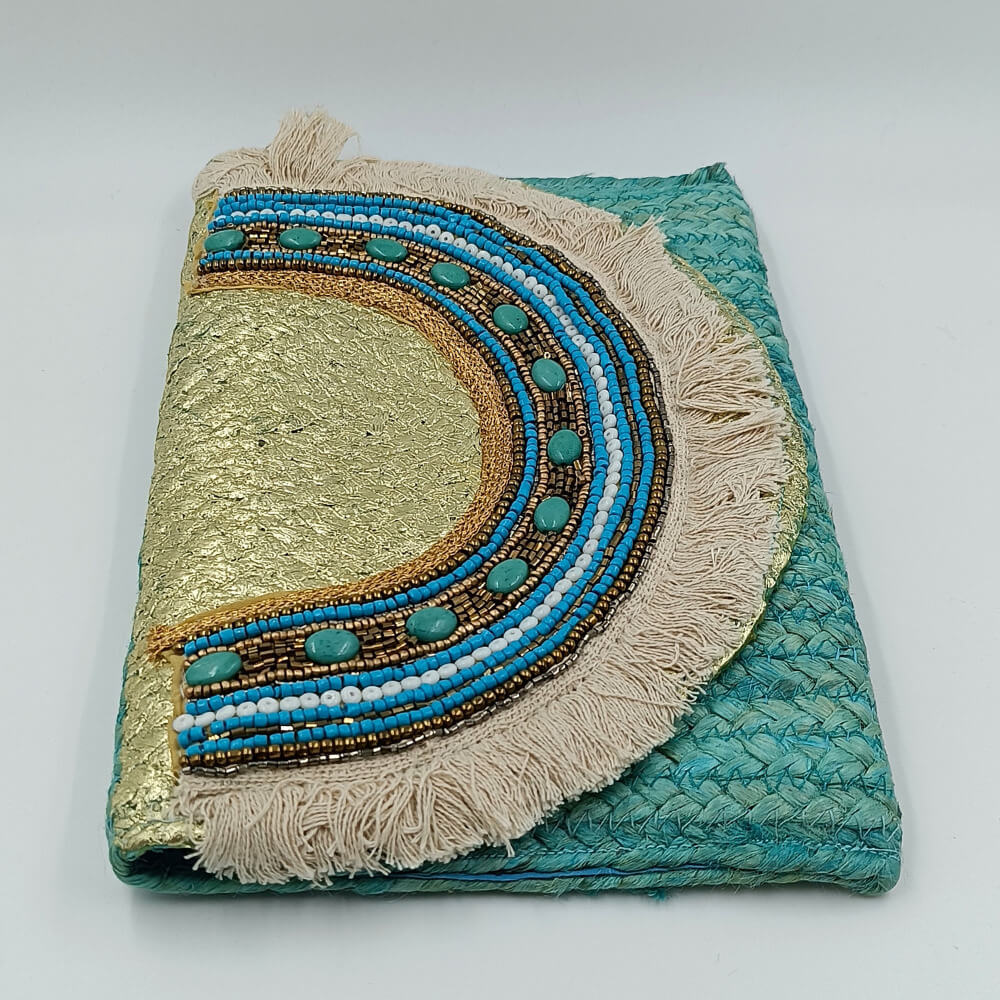 Η ψάθινη υφή σε τιρκουάζ απόχρωση δίνει φρεσκάδα και καλοκαιρινό ύφος. Η διακόσμηση με χάντρες σε αποχρώσεις του μπλε, του λευκού και του χρυσού δημιουργεί ένα εντυπωσιακό ethnic αποτέλεσμα. Τα κρόσια προσθέτουν κίνηση και αυθεντικό boho στιλ.