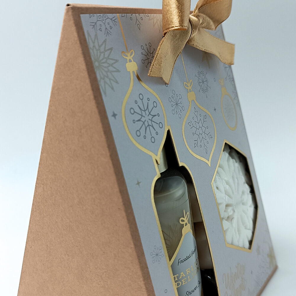 Εντυπωσιακή συσκευασία σε δώρο σετ αφρόλουτρο Vanilla με σαπούνι Snowflake Christmas Edition. Ένα οικονομικό σετ δώρου που θα της μείνει αξέχαστο χάρις στην υπέροχη μυρωδιά βανίλιας αλλά και την εντυπωσιακή συσκευασία δώρου που είναι σε τρίγωνο σχέδιο. Ο σχεδιασμός και η απεικόνιση στις κρεμαστές μπάλες χαρίζουν μία γιορτινή αισθητική με έμφαση στη Χριστουγεννιάτικη διάθεση.