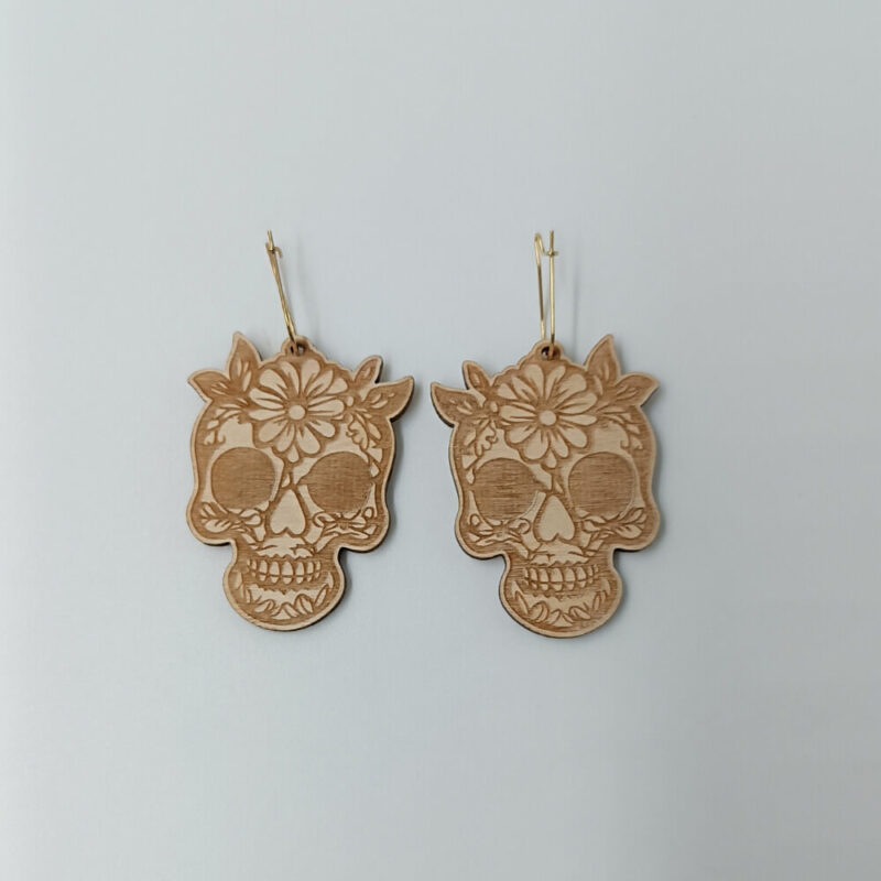 Ξύλινα σκουλαρίκια Sugar Skull με χάραξη λουλουδιών | ToXylo