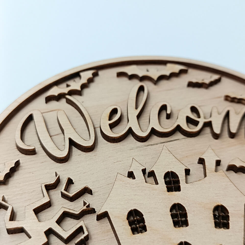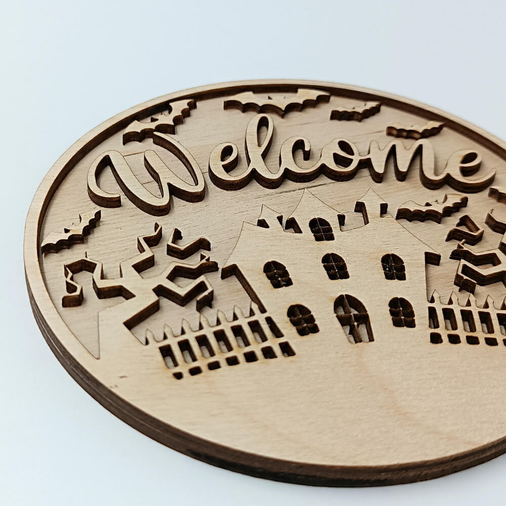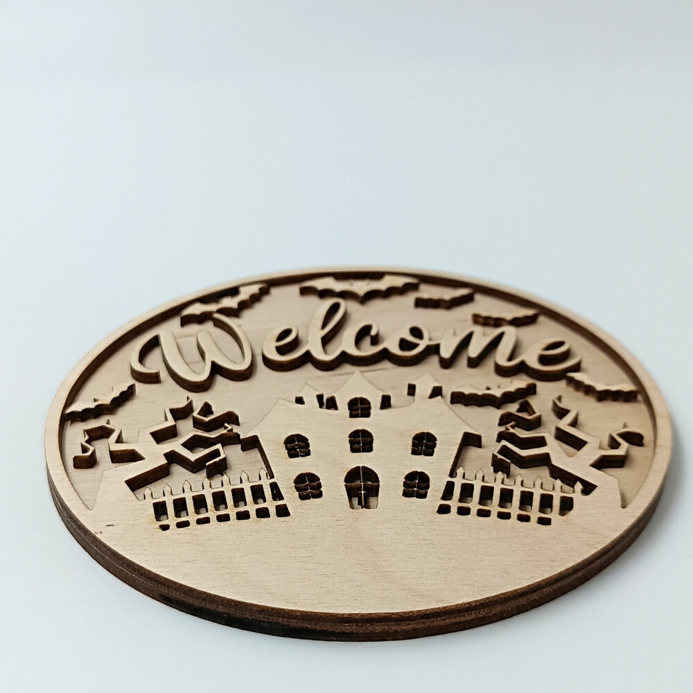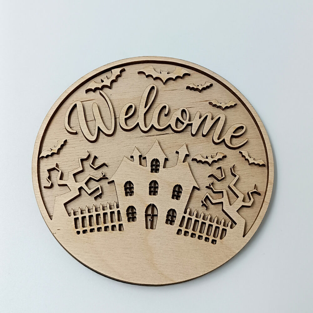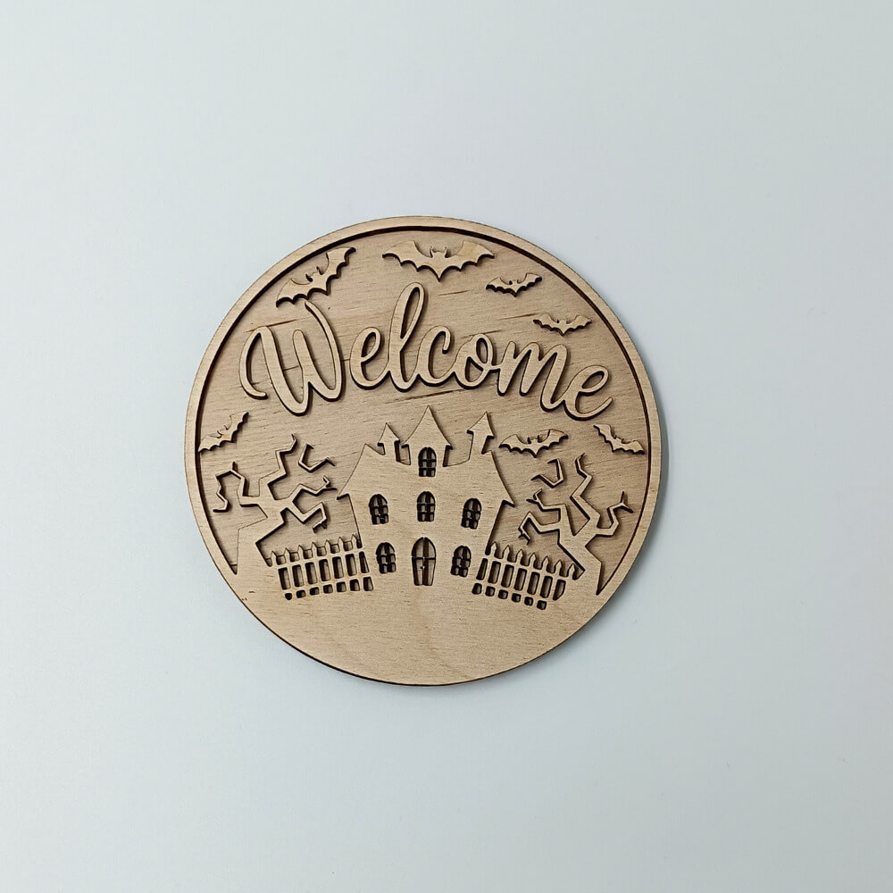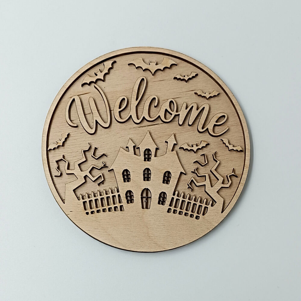 Υποδεχθείτε το Halloween με στυλ με το ξύλινο διακοσμητικό “Welcome” σε στρογγυλό σχέδιο. Με λεπτομέρειες κοπής laser που απεικονίζουν στοιχειωμένο σπίτι, δέντρα και νυχτερίδες, δημιουργεί την απόλυτη ατμόσφαιρα τρόμου και γιορτινής διάθεσης.