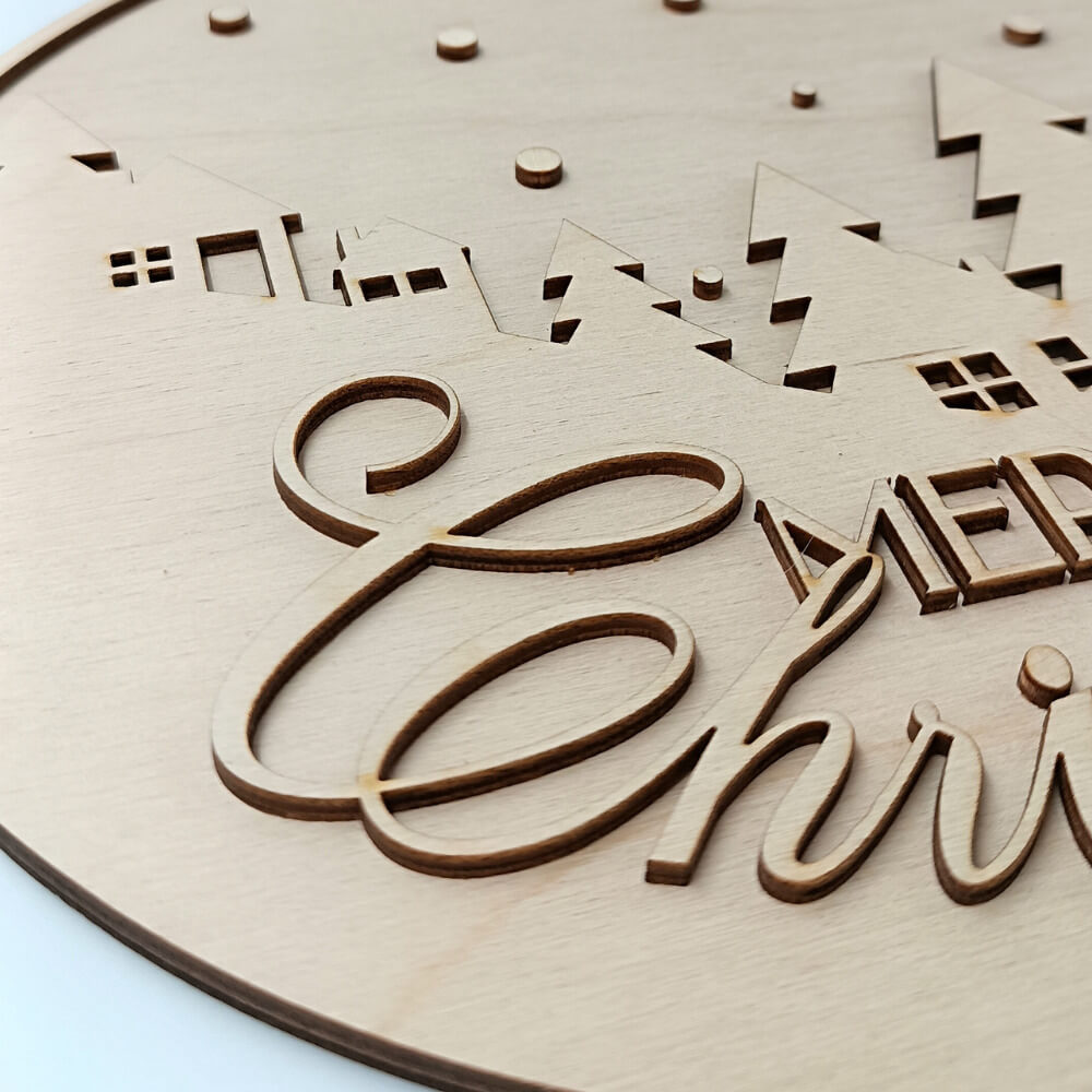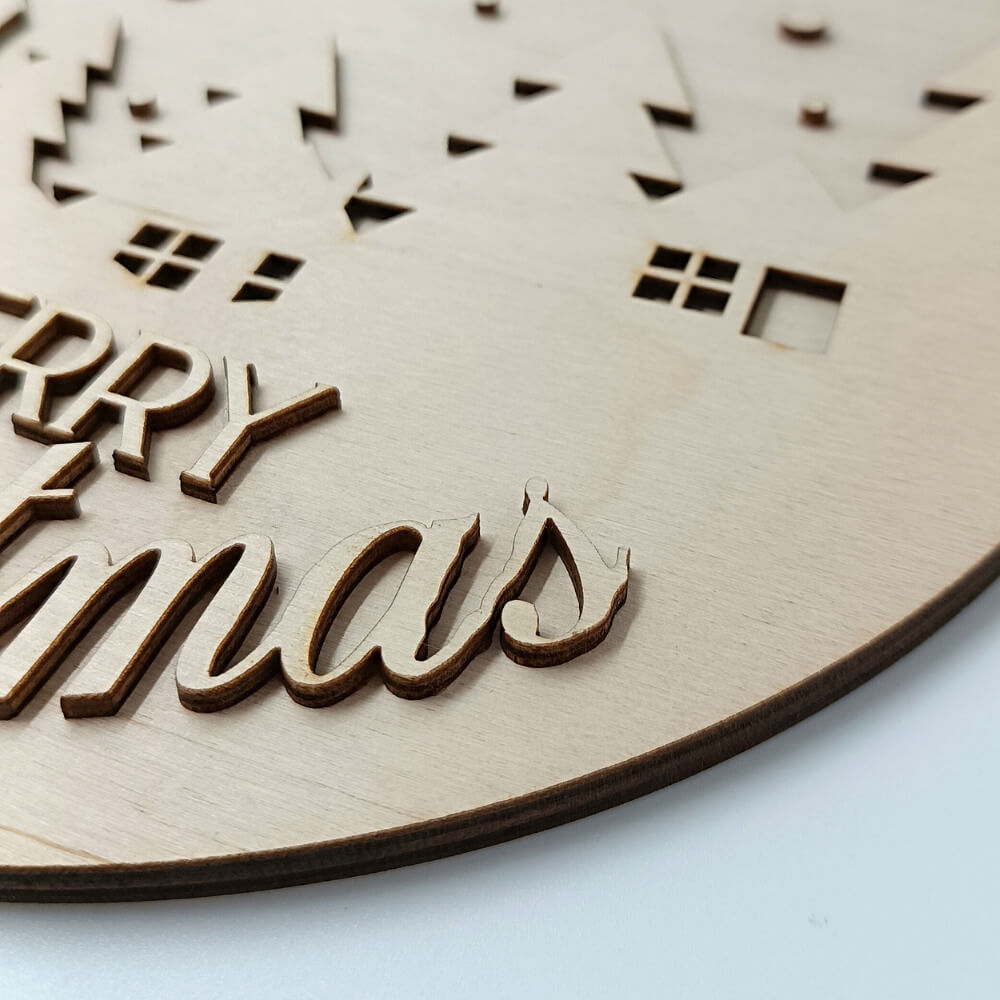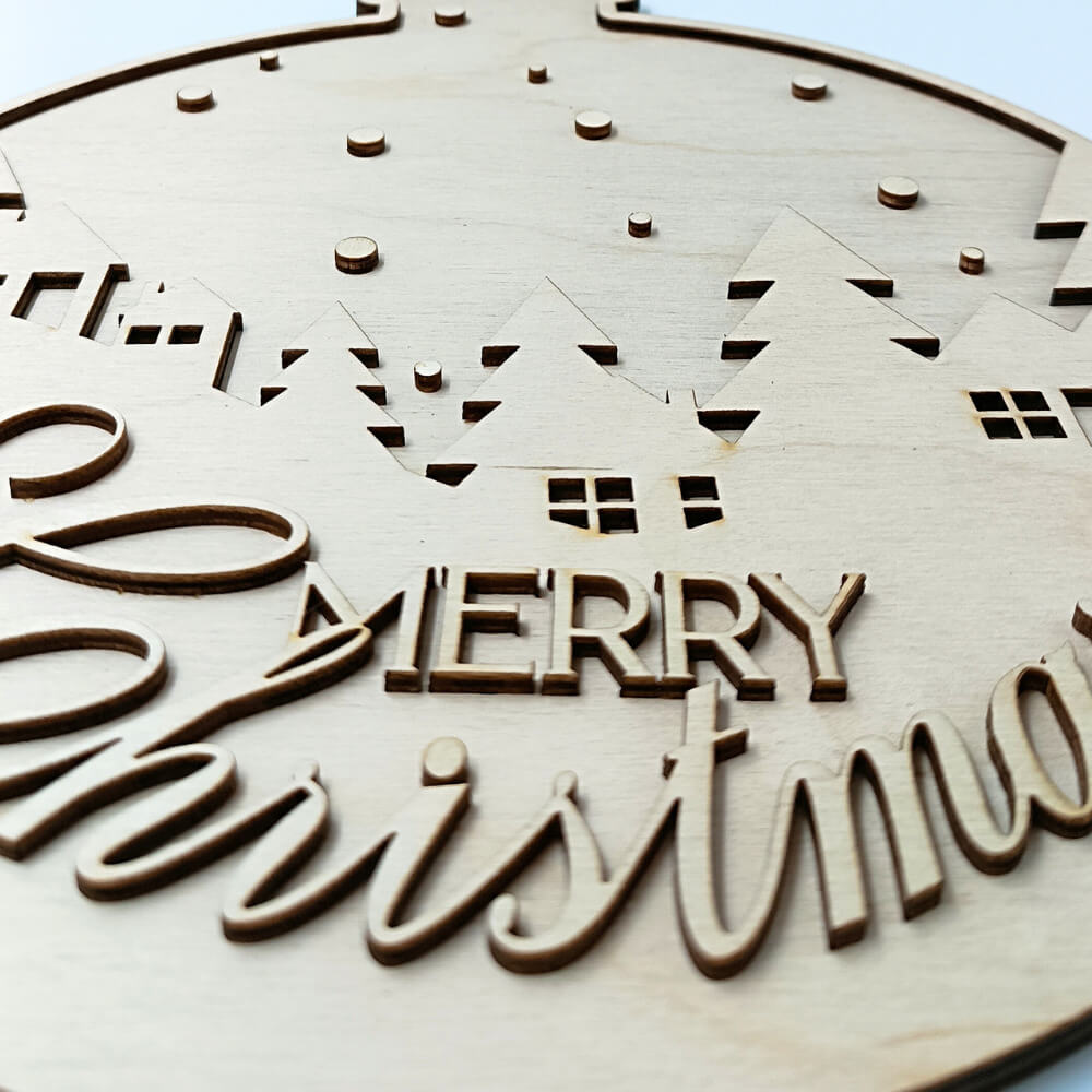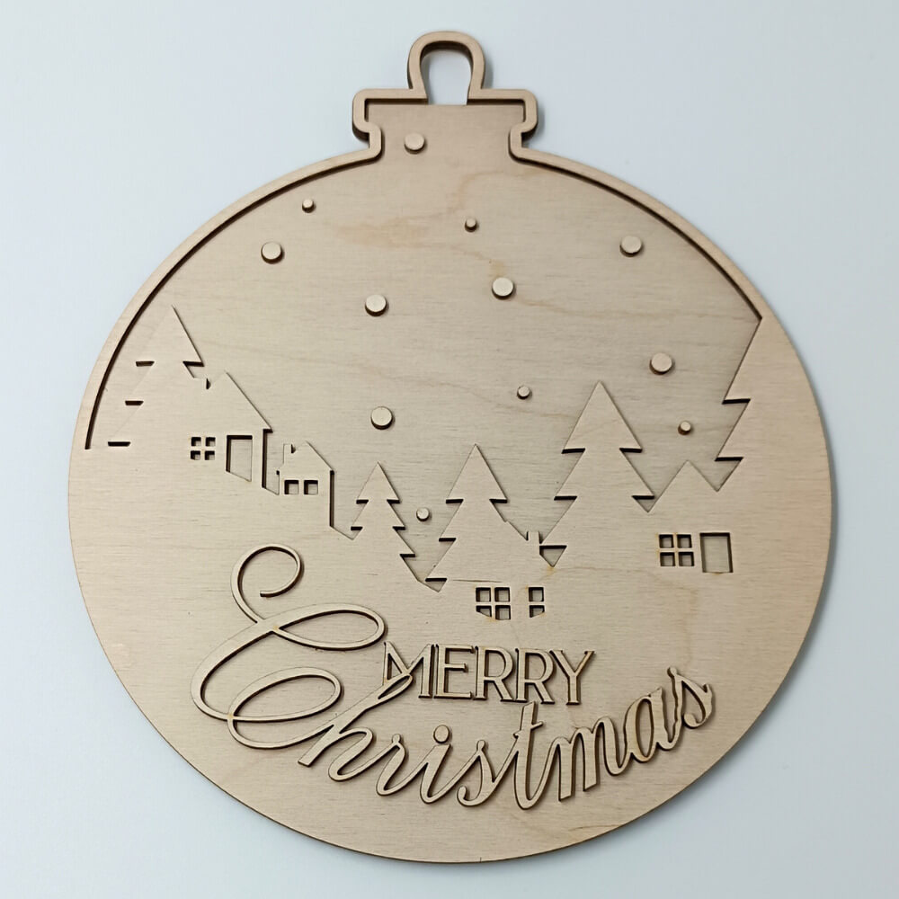 Φέρτε τη γιορτινή μαγεία στο σπίτι ή το κατάστημά σας με το ξύλινο χριστουγεννιάτικο διακοσμητικό μπάλα “Merry Christmas” από ToXylo. Με κομψό σχέδιο κοπής laser που απεικονίζει χειμωνιάτικο τοπίο με δέντρα, σπιτάκια και νιφάδες χιονιού, δημιουργεί μια ζεστή και παραμυθένια ατμόσφαιρα.