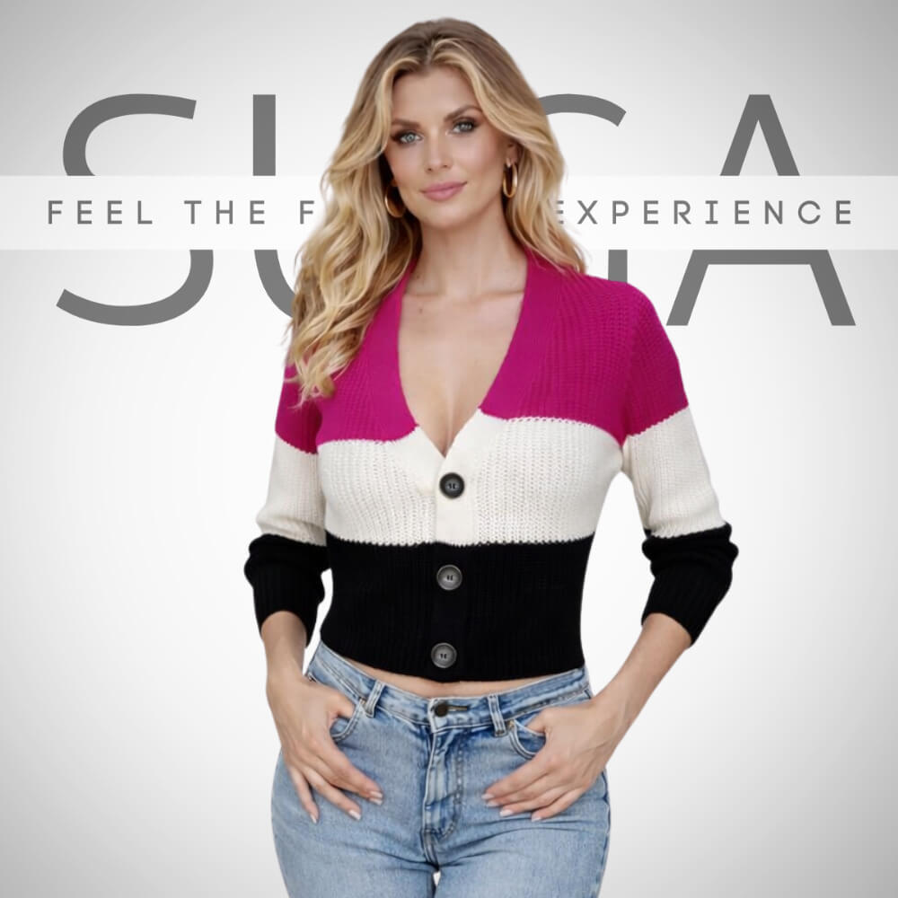 Υπέροχη πλεκτή ζακέτα cropped με κουμπιά σε color mix τριών χρωμάτων: Φούξια – Λευκό – Μαύρο. Η ζακέτα έχει σύνθεση από υψηλής ποιότητας υλικά και αποτελεί ιδανική επιλογή για τις πιο κρύες μέρες του χειμώνα μιας και το ύφασμα της είναι ότι πιο ζεστό μπορείς να φορέσεις! Κλείνει μπροστά με κουμπιά σε υπέροχα χρώματα που ταιριάζουν απόλυτα και με τα τρία χρώματα και έχει V ανοιχτό μέχρι στο στήθος για να κολακεύει το ντεκολτέ.